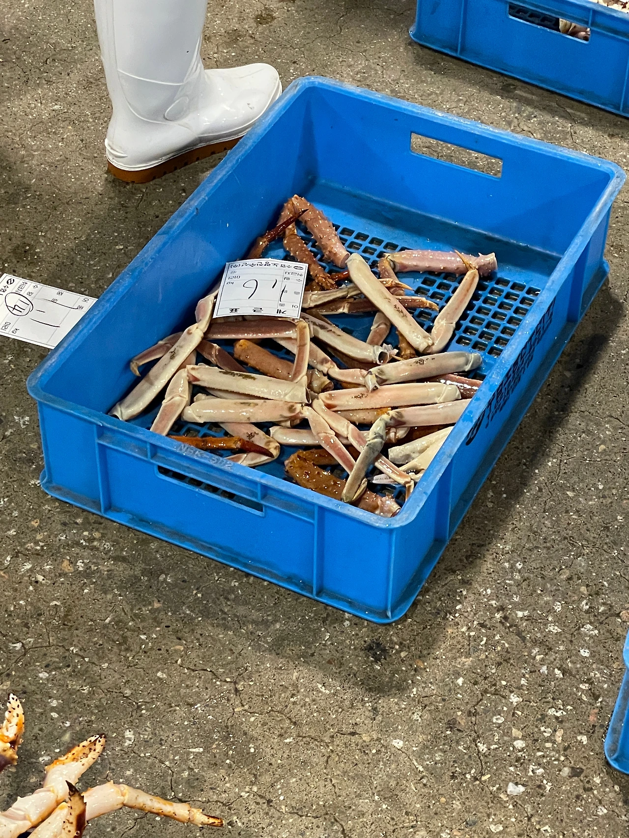 4시 10분경, 킹크랩을 담은 파란 바구니들 앞에서 목소리가 울려 퍼졌다. 갑각류 경매 시작이다. 어떤 바구니엔 다리만 잔뜩 들어있었다. 여기 오는 동안 누군가는 이미 다리가 절단된 것이다. 덜렁. 다리들만 모아 무게가 적혀있었다. 자투리 몸뚱이.