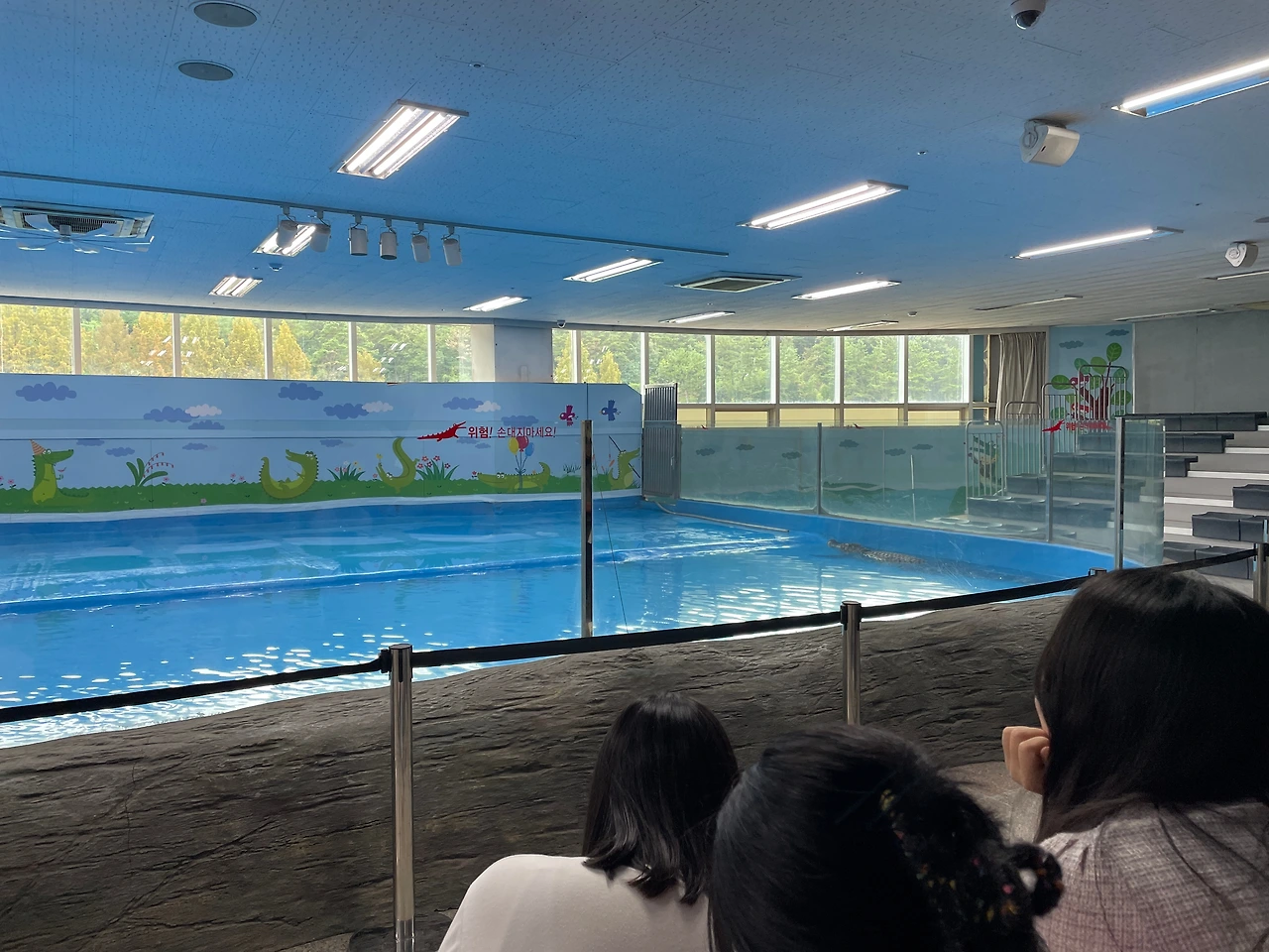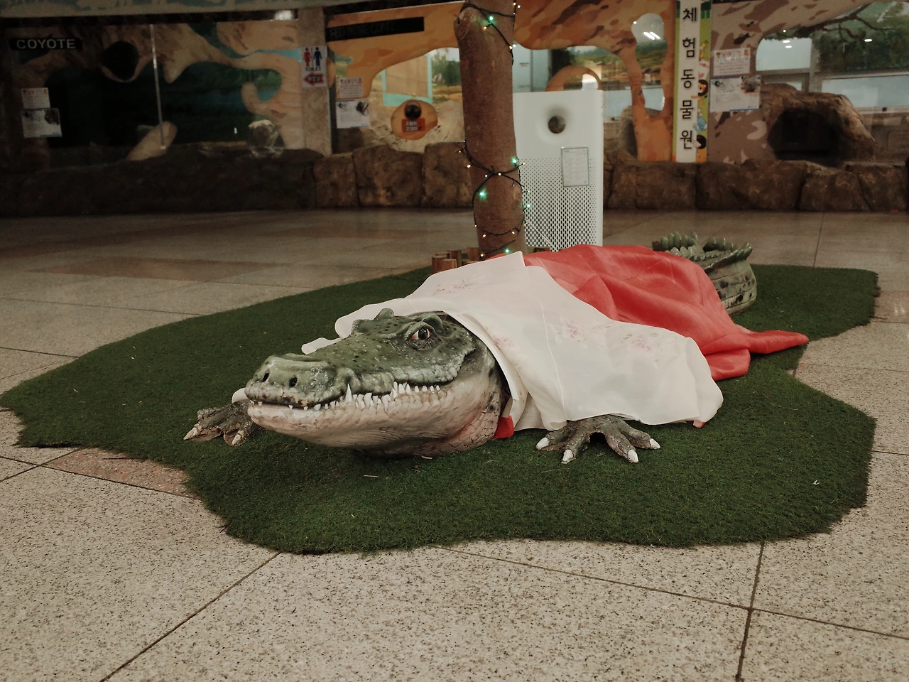 악어쇼 입구 앞에는 가짜 악어에 한복이 입혀져 있었다. ‘악어 생태’를 관람하고 나온 어린이들에게 악어는 포식자가 아닌 그저 웃기고 만만한 동물로 기억될 것이다. 날카로운 이가 있어도 인간을 물지 않는(못하는) 동물, 인간이 질질 끌고 다니며 조롱해도 되는 몸.