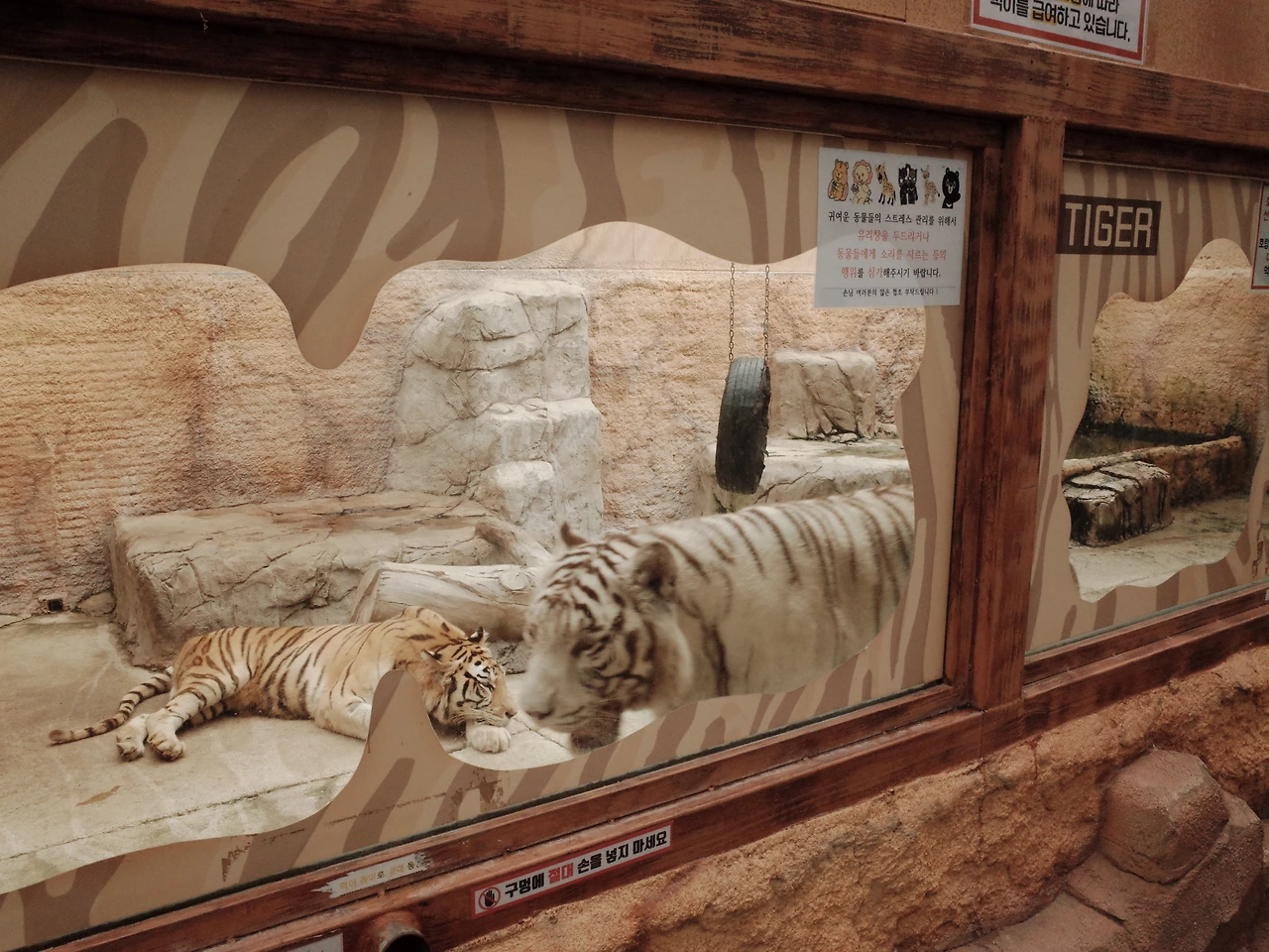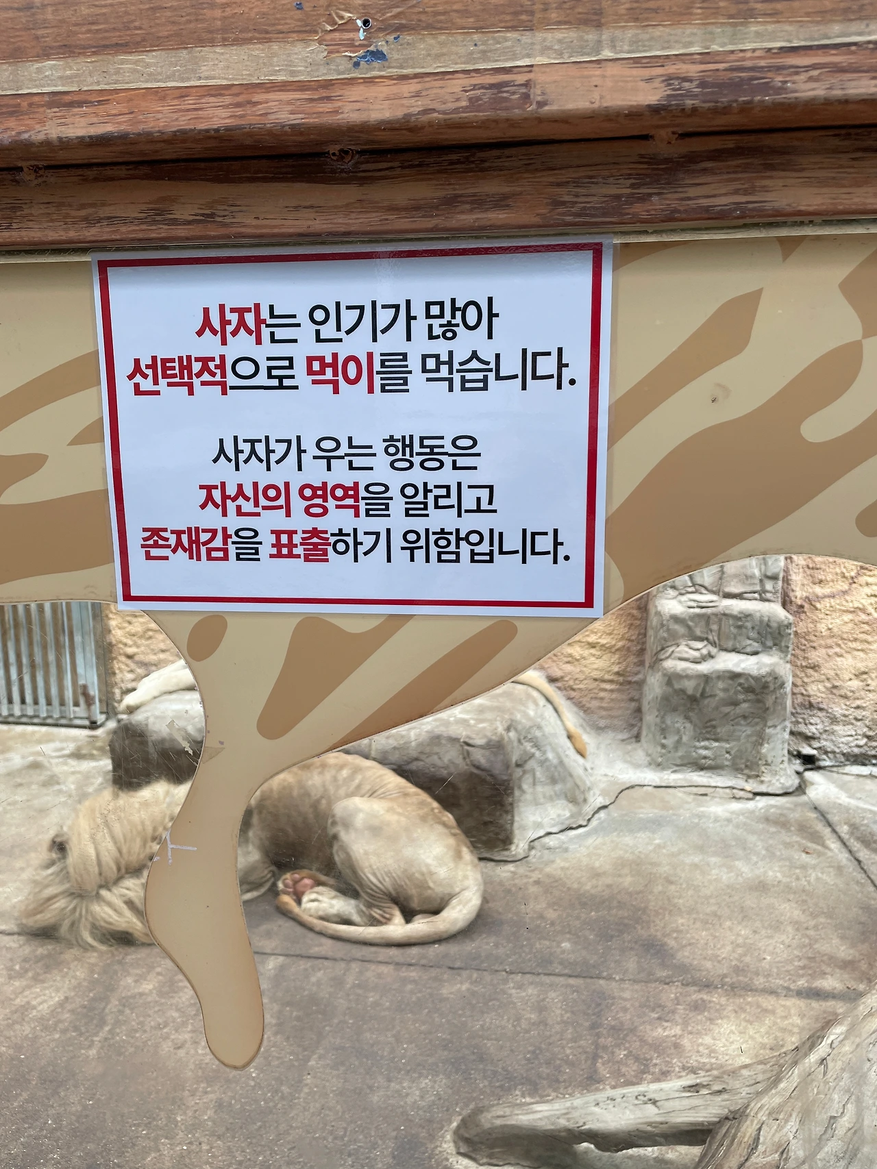 이곳은 동물학대에 대한 대중의 인식을 신경 쓰는 것 같았다. 곳곳에는 동물이 케어받고 있다는 ‘증거’가 전시되어 있었다. 전시생물 행동 풍부화 관련 자료들이 벽에 부착되어 있었고 ‘호기심과 흥미유발, 자연친화적 놀이환경 조성’과 같은 표현이 있었다. 또한 ‘먹이 체험’은 간식일 뿐이며, “모든 동물들은 먹이체험과 별개로 정해진 식사 시간에 정해진 식사량에 따라 먹이를 급여“하고 있다고 안내문에 적혀 있었다. 점박이하이에나의 안내문에는 ”등에 상처는 짝짓기를 하다가 생긴 가벼운 상처이니 안심“하라고 적혀 있었다.