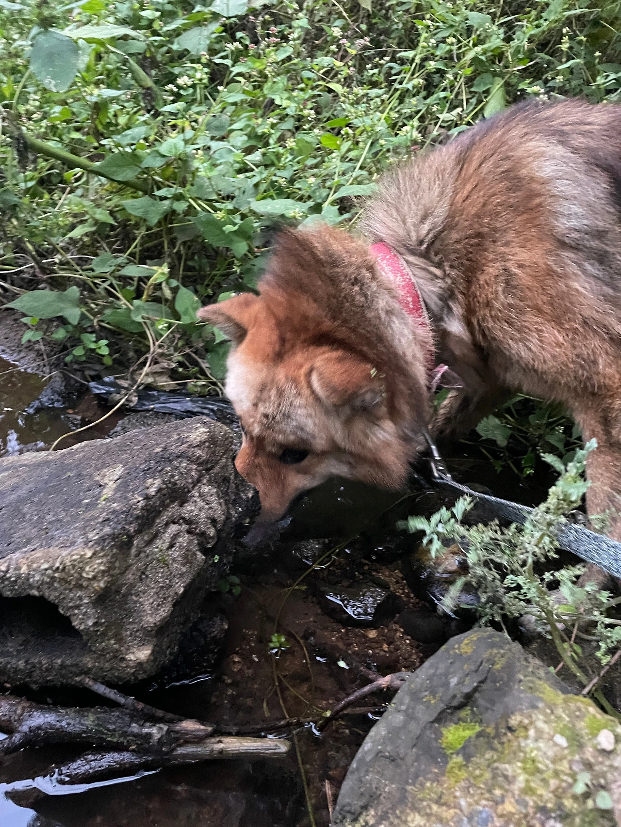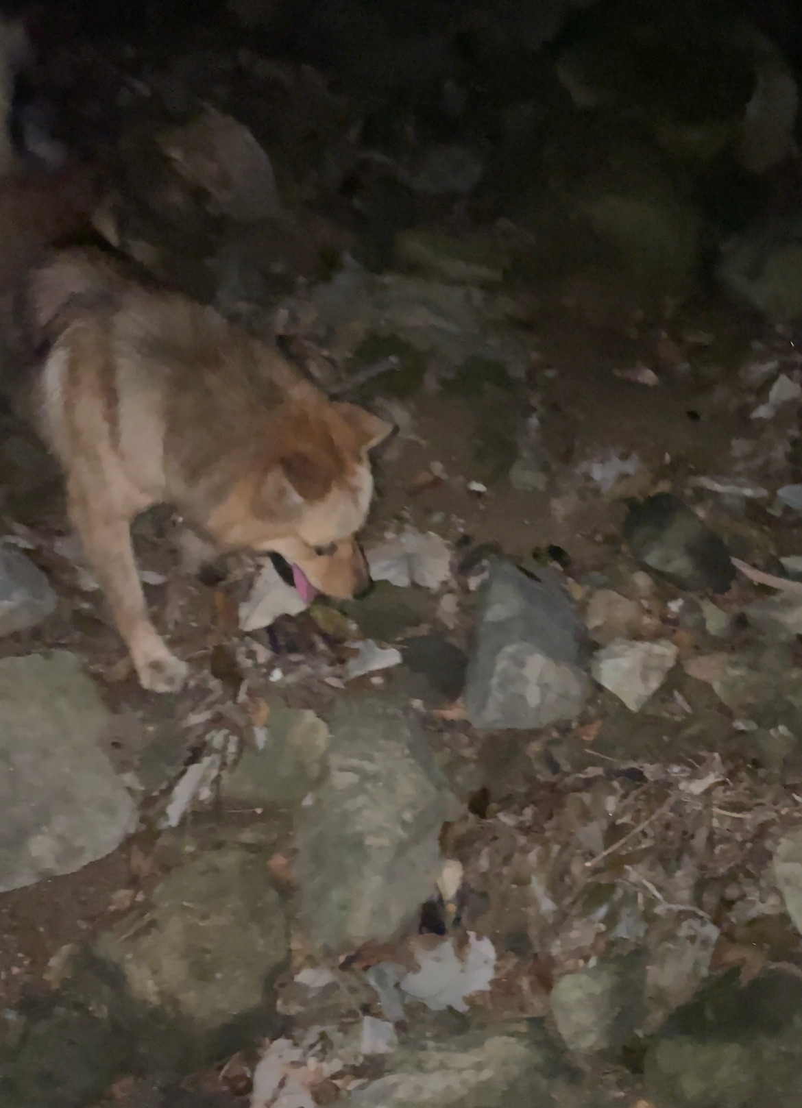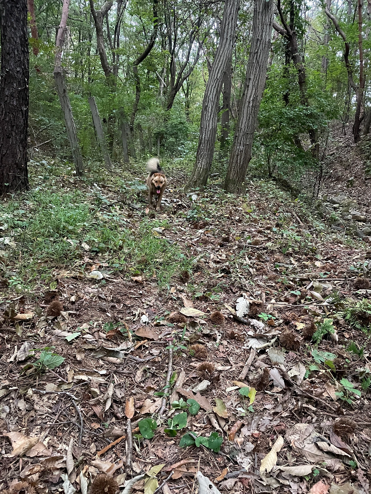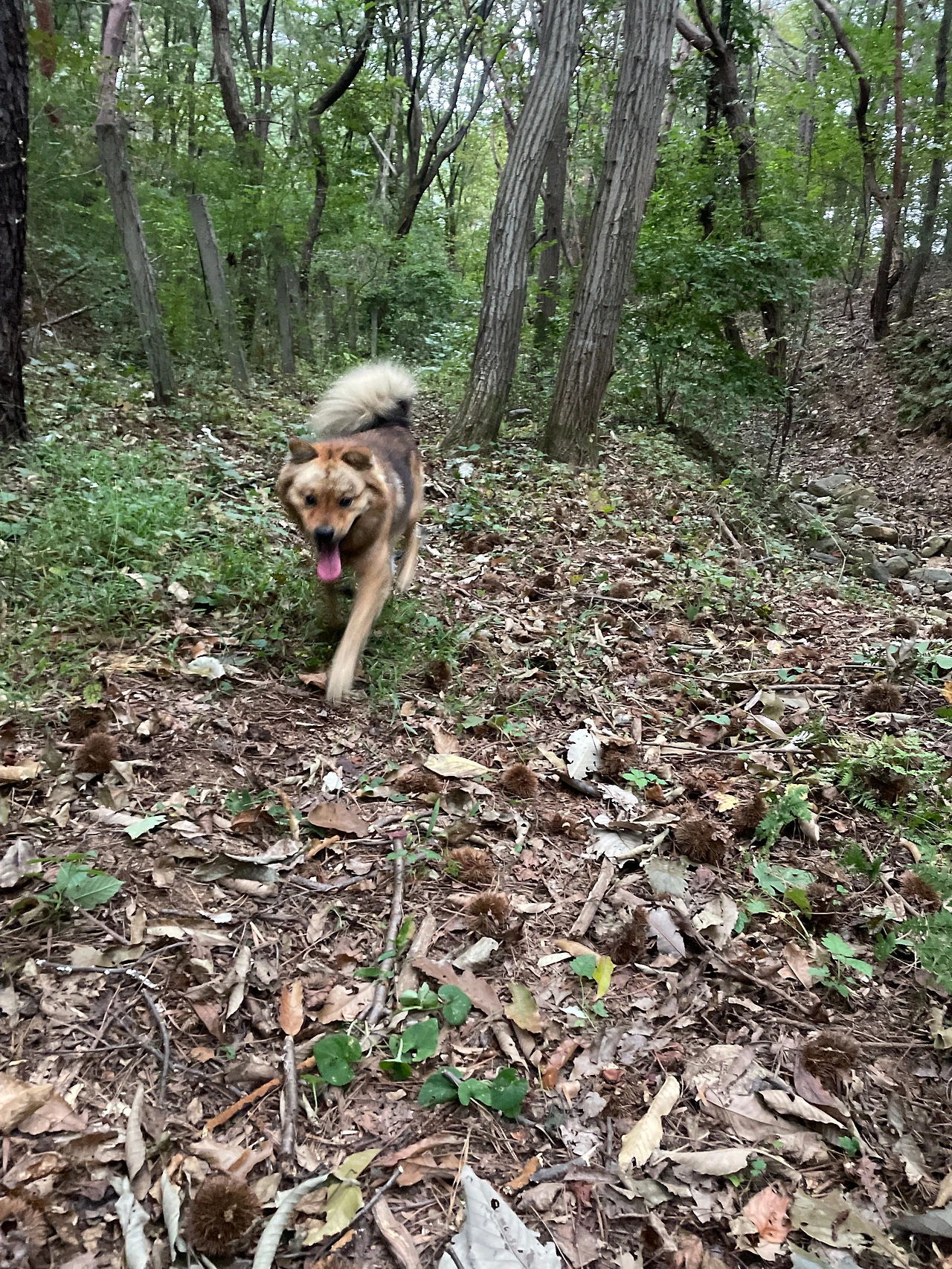 과거 산으로부터 물이 내려와 흘렀을 것 같은, 동그란 돌멩이와 바위가 가득한 물길 비슷한 게 남아 있는 그 산은 우리의 자유 공간이 되었다. 숯댕이는 이곳에서 한 시간 정도 자유롭게 보낸다. 내가 쥔 줄을 내려놓으면 숯댕이는 산길을 뛰어다닌다. 구간반복한다.