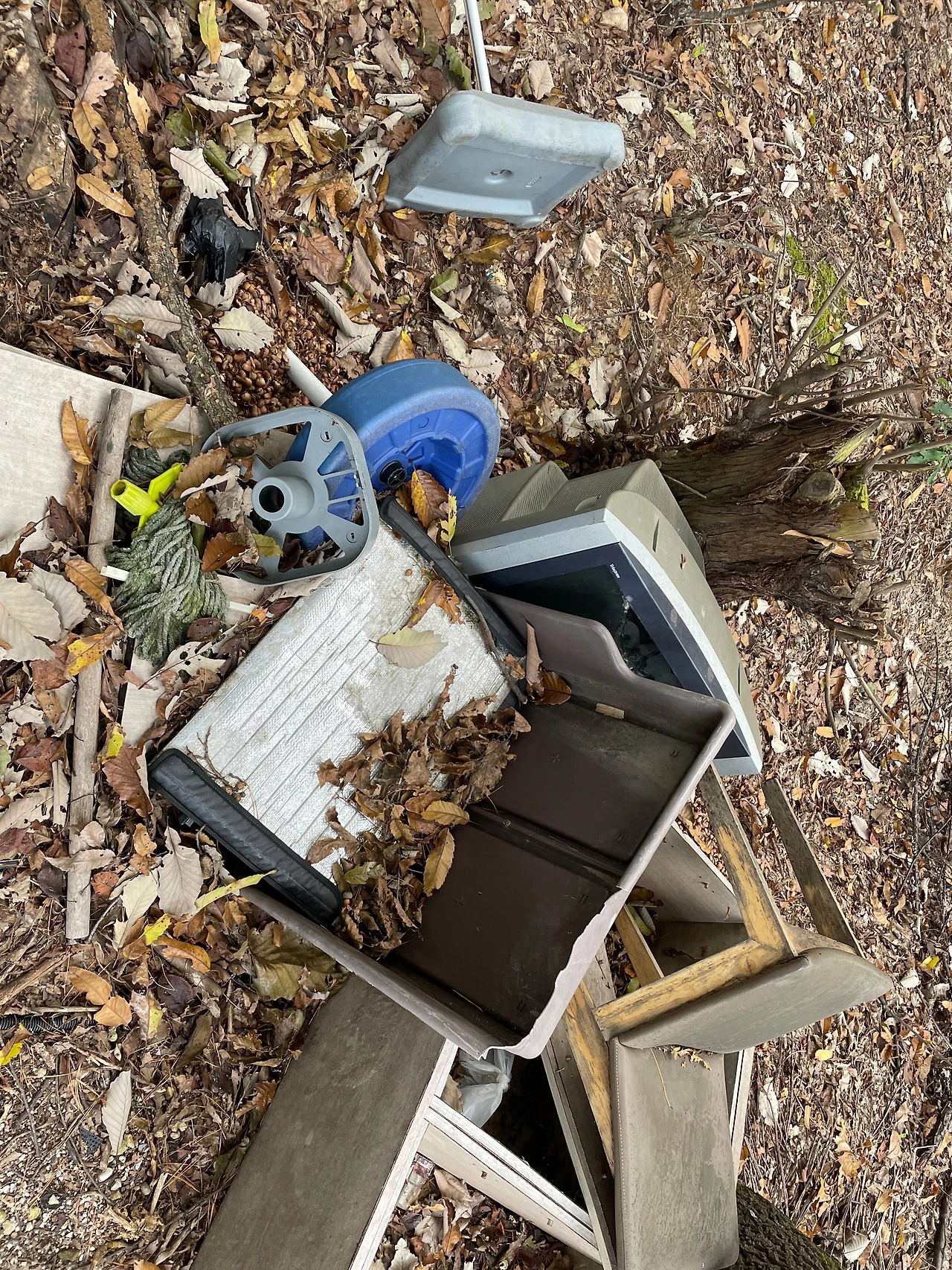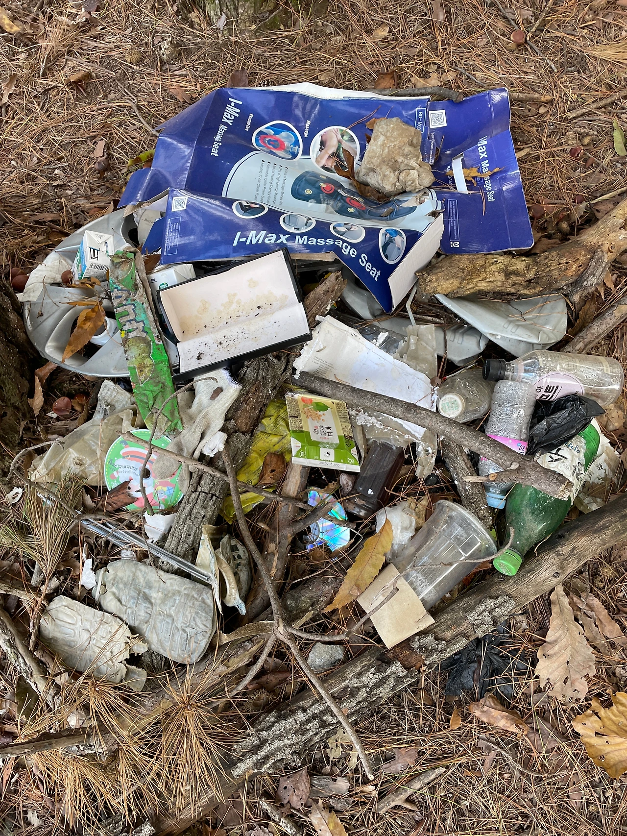 사람들이 가전제품부터 정체불명의 약품병까지 갖다 버리는 산길이 있다. 온갖 자질구레한 쓰레기가 펼쳐진 그곳엔 깨진 유리가 너무 많아 처음 그 길을 갔을 땐 숯댕이 발이 베일까 조마조마했다. 하지만 그런 것 따위는 개의치 않는 숯댕이를 보며(막을 수도 없었고) 그 구간을 주 산책 경로로 이용하게 되었다. 그 구간은 제초제 경고 현수막과 쓰레기 때문인지 등산객도, 주민도 거의 찾지 않는 버려진 쓰레기산 같았다.