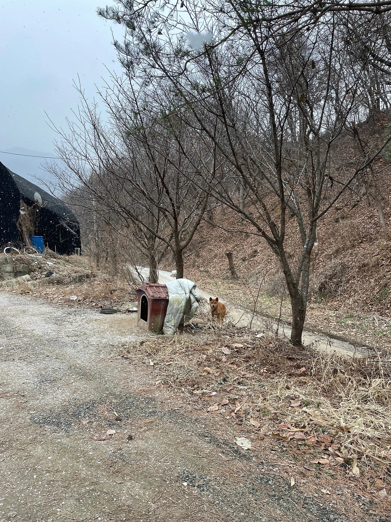 진눈깨비가 내리기 시작했다. 오늘은, 눈에 밟혔던 그 개에게 다가가 보기로 했다. 밥이 없을 것 같아서였다. 사료와 간식을 담은 봉지를 들고 숯댕이와 함께 다가가자 그 개는 짖지도 않고, 그저 주눅 들었다. 숯댕이가 흥분해서 잠시 하네스 줄을 옆 나무에 묶어두고 혼자 다가갔다.