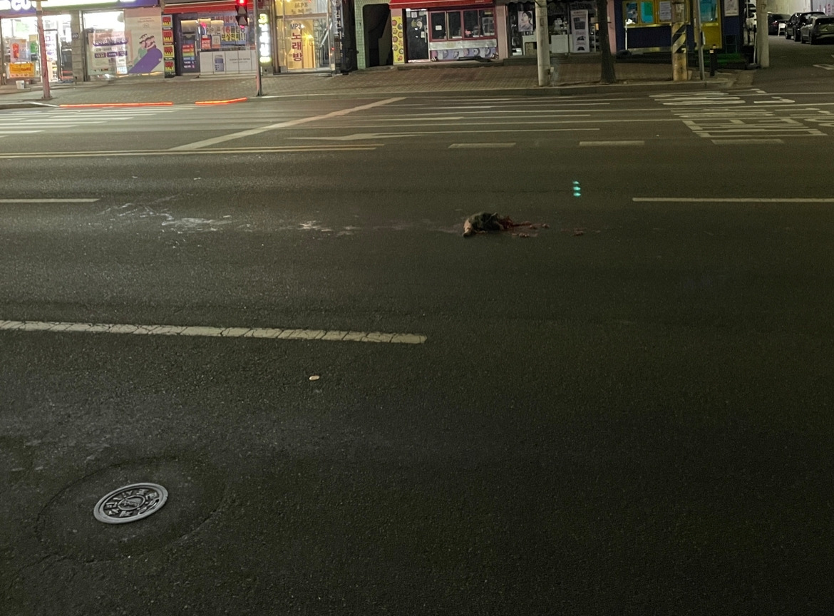 배낭을 내려놓고, 목도리를 풀고 대기했다. 초록불로 바뀌면 빠르게 해야 한다. 자정을 향하는 시간이었지만 차들은 꾸준히 있었다. 초록불을 기다리며, 차가 시신을 추가로 깔아뭉갤까 초조했다.