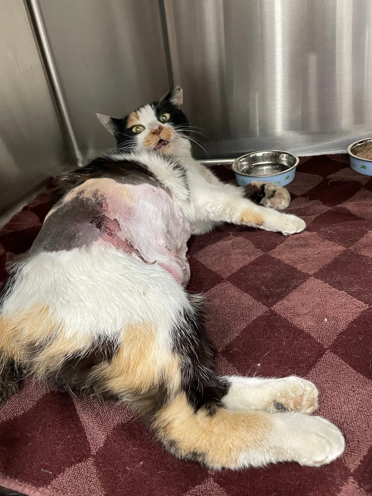 사진 속 카레의 배엔 구멍이 여럿 있었다. 복막이 찢어져 장기가 쏟아져 나와 꿰매고 또 꿰매었다고 한다. 뼈가 부러졌고, 척추에 손상이 갔을 확률이 높다고 했다. 뒷다리를 쓰지 못하는 불구로 살아갈 수 있다고 했다. 장애를 가진 고양이가 재개발구역에선 살아가기 힘들어도 가정에선 살아갈 수 있다.