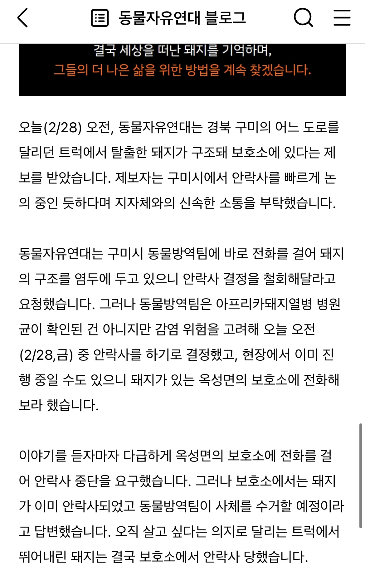살아있는 집돼지가 ‘유실물’처럼 길에 놓여있는 것은 기적에 가까운 일이다. 그 기적이 일어났지만 할 수 있는 것은 없었다. 아마 누구도 못했을 것이다. 동자연 블로그에 따르면, “감염 위험을 고려해” 죽임 당했으니까.
