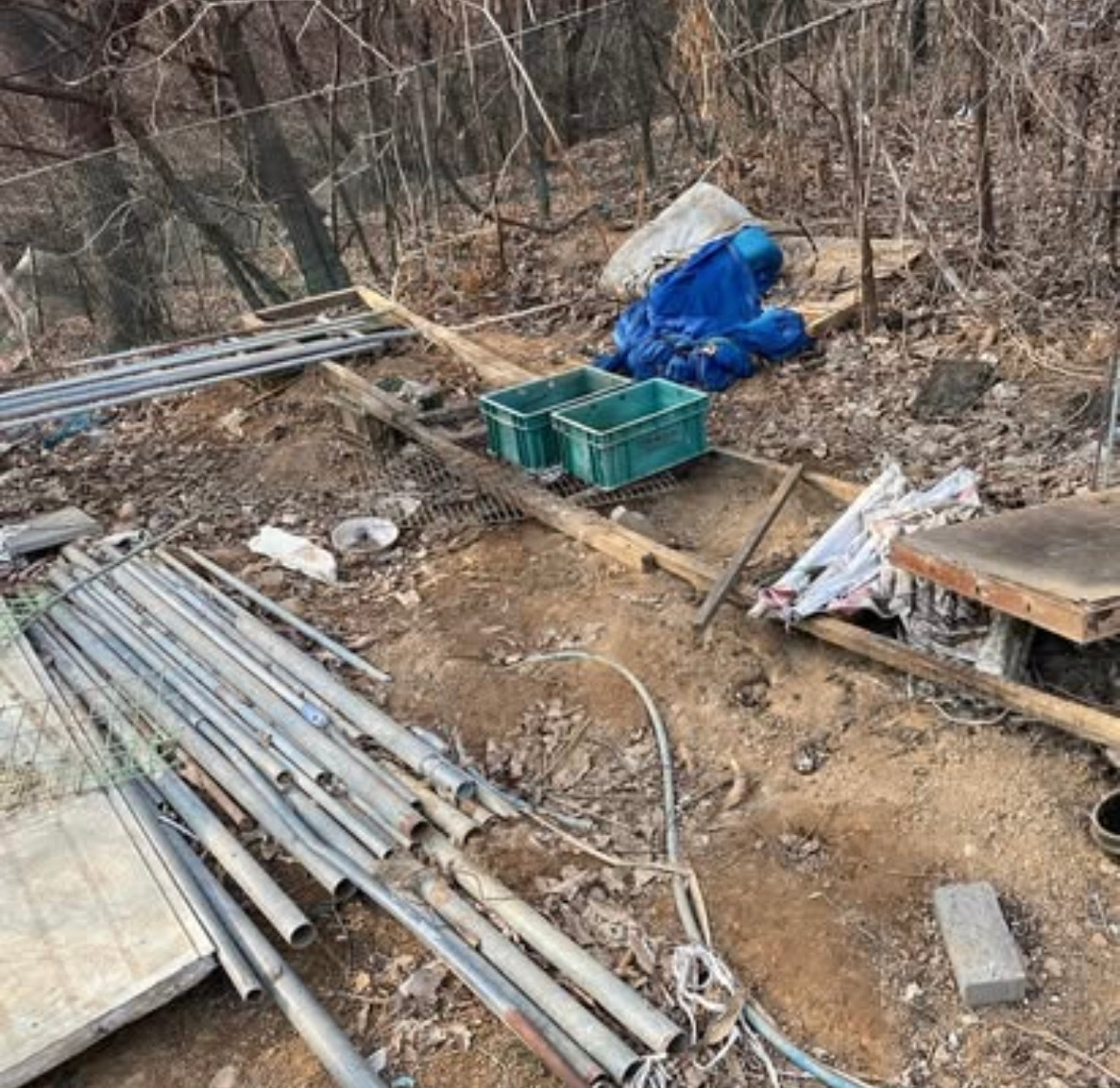 철거가 진행된 개농장에는 농장주의 생활이 고스란히 담겨있다. 농장 전체는 그물로 둘러쌓여 있고, 그 안에는 텃밭이 있다. 한쪽엔 작은 비닐하우스가 있고 그 주변엔 그의 옷 같은 것들이 널려있다.