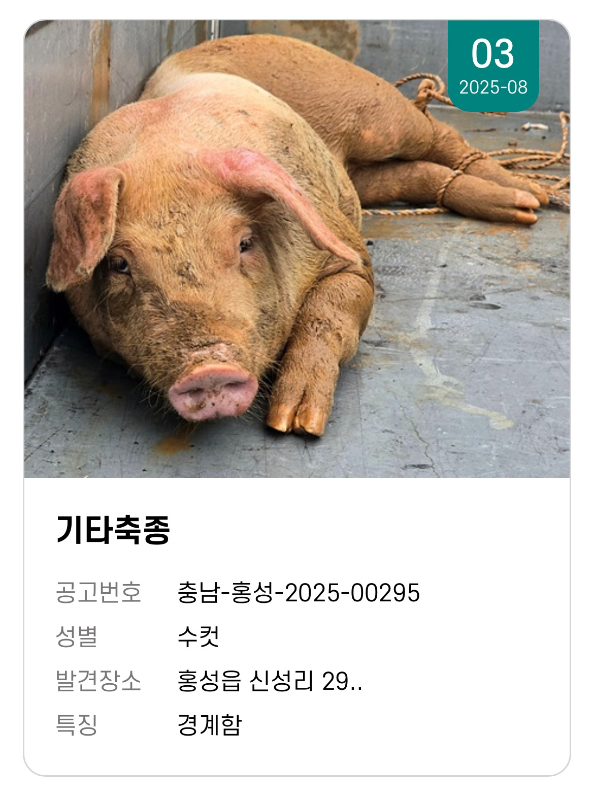 한 번씩 ‘유실물’처럼 올라온 동물을 찾아본다. ‘기타 축종’으로 검색하면 닭, 뱀, 앵무새, 염소, 돼지 등 다양한 이들의 사진이 뜬다. 개나 고양이처럼 일정 기간 후 ‘처분’되는 것은 마찬가지지만 이들을 주목하는 이는 거의 없는 것 같다.