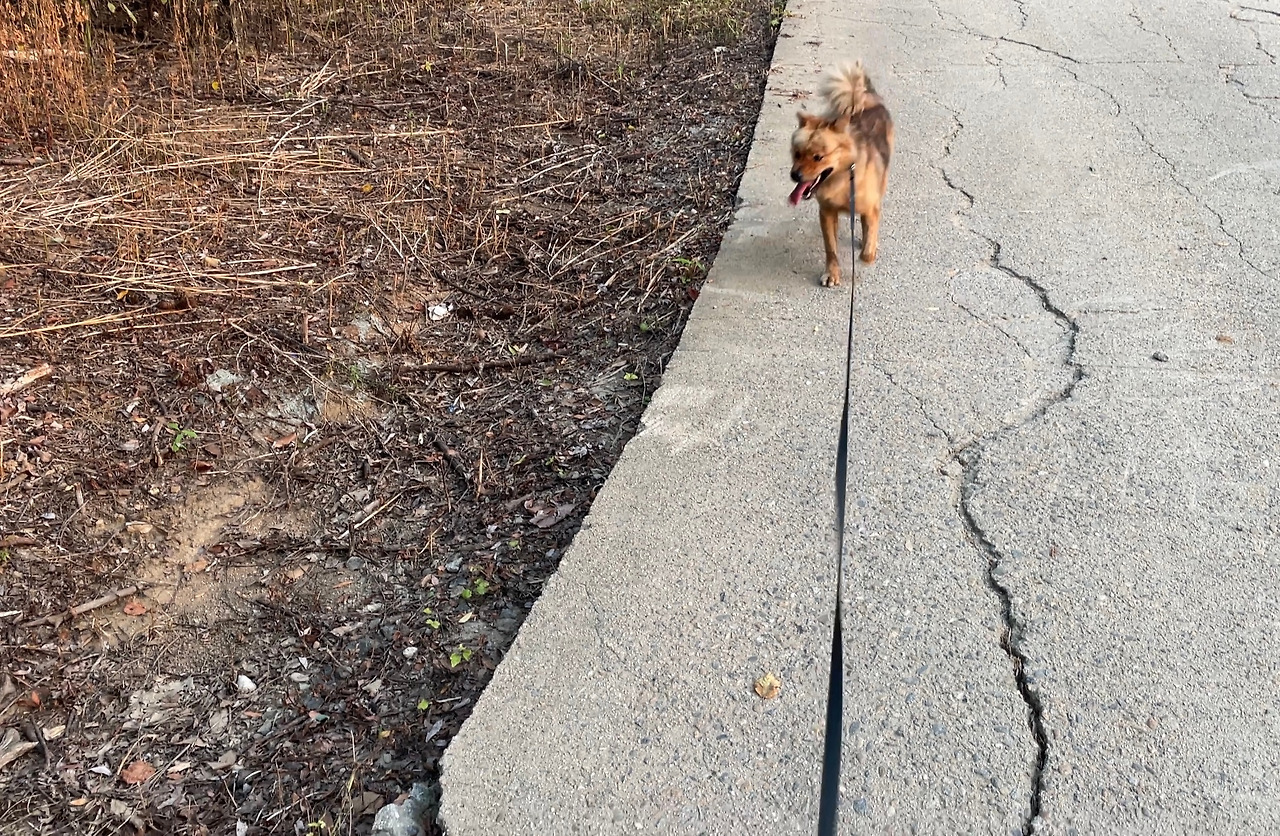 우리의 공간에는 누구도 없었다. 원래도 인적이 거의 없는 야산의 길이지만, 폭우 속이니 더 그랬다. 나는 힘들지만, 숯댕에겐 (다른 인간으로부터) 안전한 상태가 된다. (그래서 날씨가 구린 날을 더 선호하기도 한다) 쾌적하고, 안전한 날씨에 익숙한 사람들은 다니지 않기 때문이다.