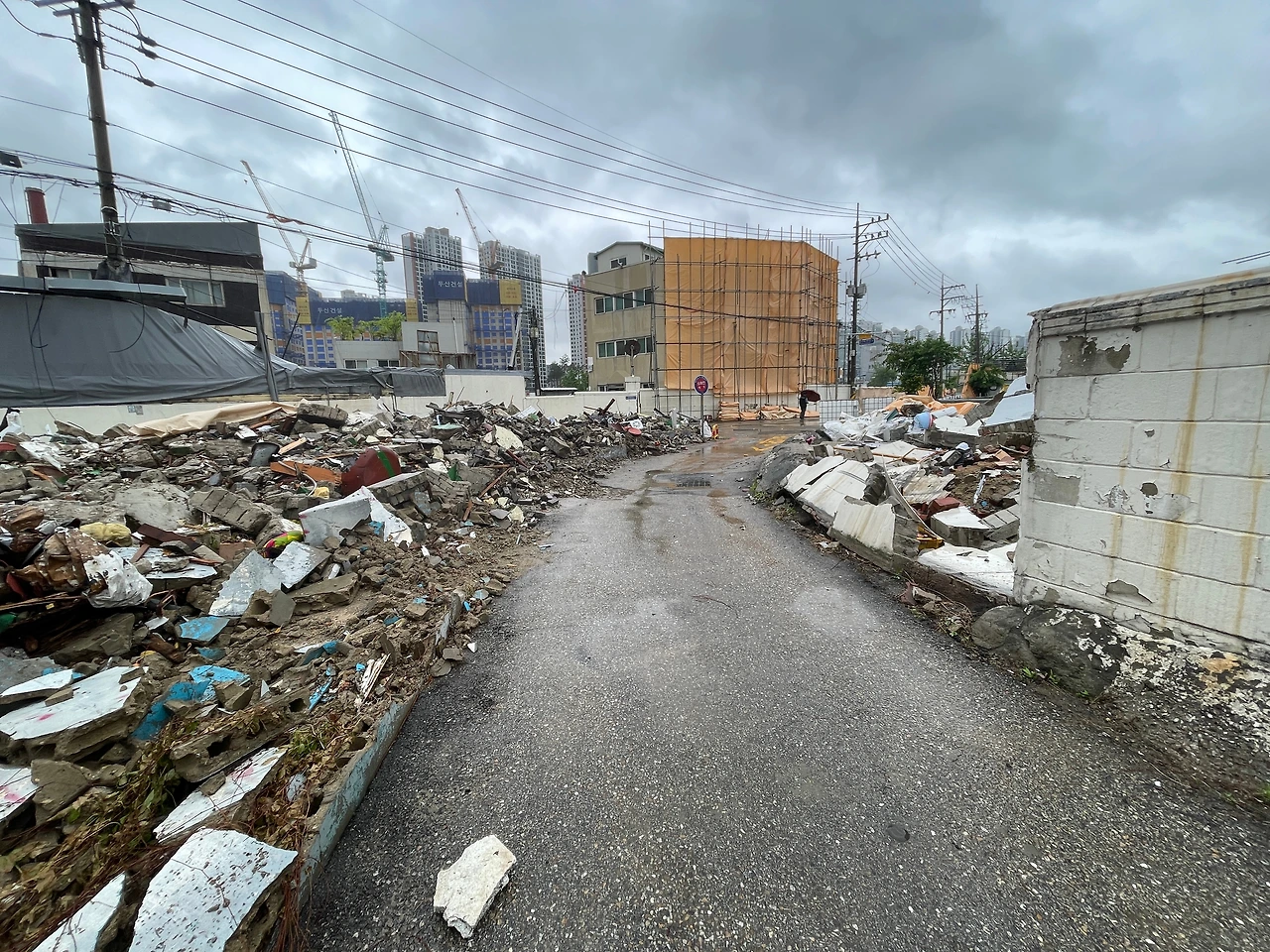 장우산을 쓰고 짐을 챙겨 재개발 구역에 갔다. 첫 번째 급식소에 갔다. 역시나, 아무도 ‘출석’ 하지 않았다. 비가 이렇게 오는데, 누가 나오겠나.