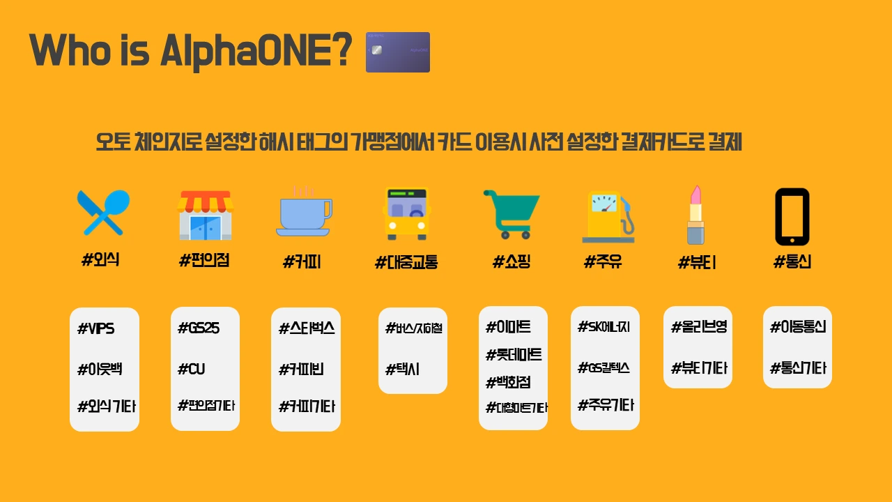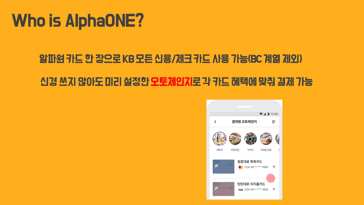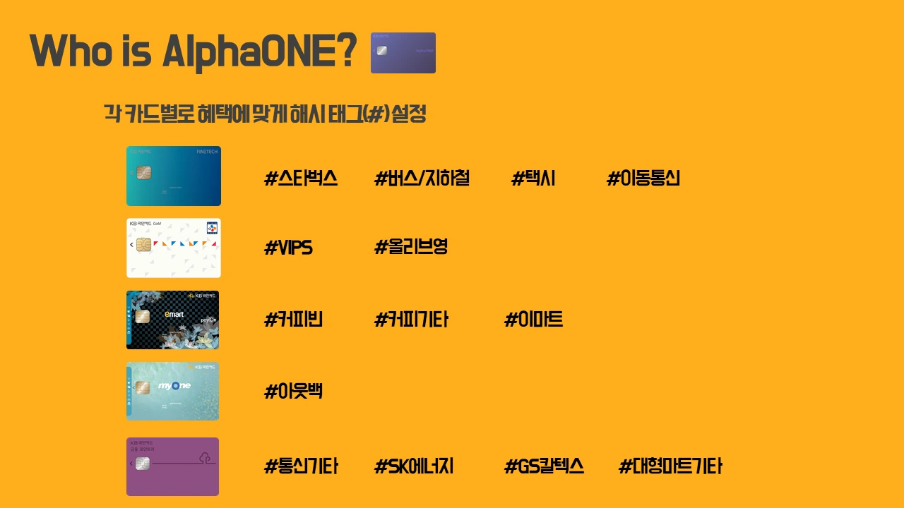 쉽게 설명하면 카멜레온과 같다고 보면 된다. 카멜레온은 그 환경에 맞춰 피부색을 바꾼다. 적을 속이기 위해서다. 반면 알파원 카드는 가맹점마다 혜택에 맞춰 피부색 대신 카드를 바꾼다. 혜택을 받기 위해서다. 여러 장의 카드를 바꾸어가면서 결제할 수 있는 결제 대용 카드라고 하면 이해하기 쉽다.
