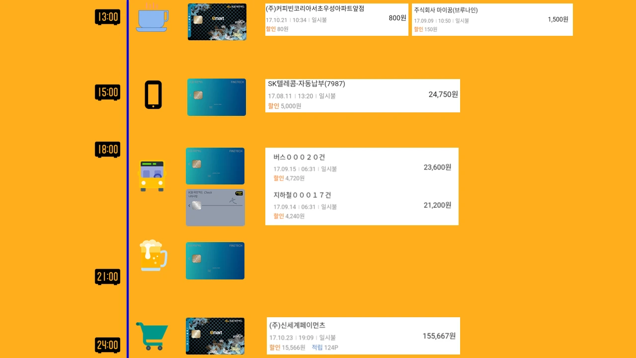 드디어 퇴근 시간이다. 버스/지하철을 타고 집에 간다. 이때는 파인테크나 나라사랑카드로 20% 교통할인을 받는다. 가는 도중에 회사 동료에게 연락이 온다. 맥주 한 잔 마시자고 한다. 할인받을 수 있는 카드가 없으므로 실적을 채울 파인 테크로 결제하자.