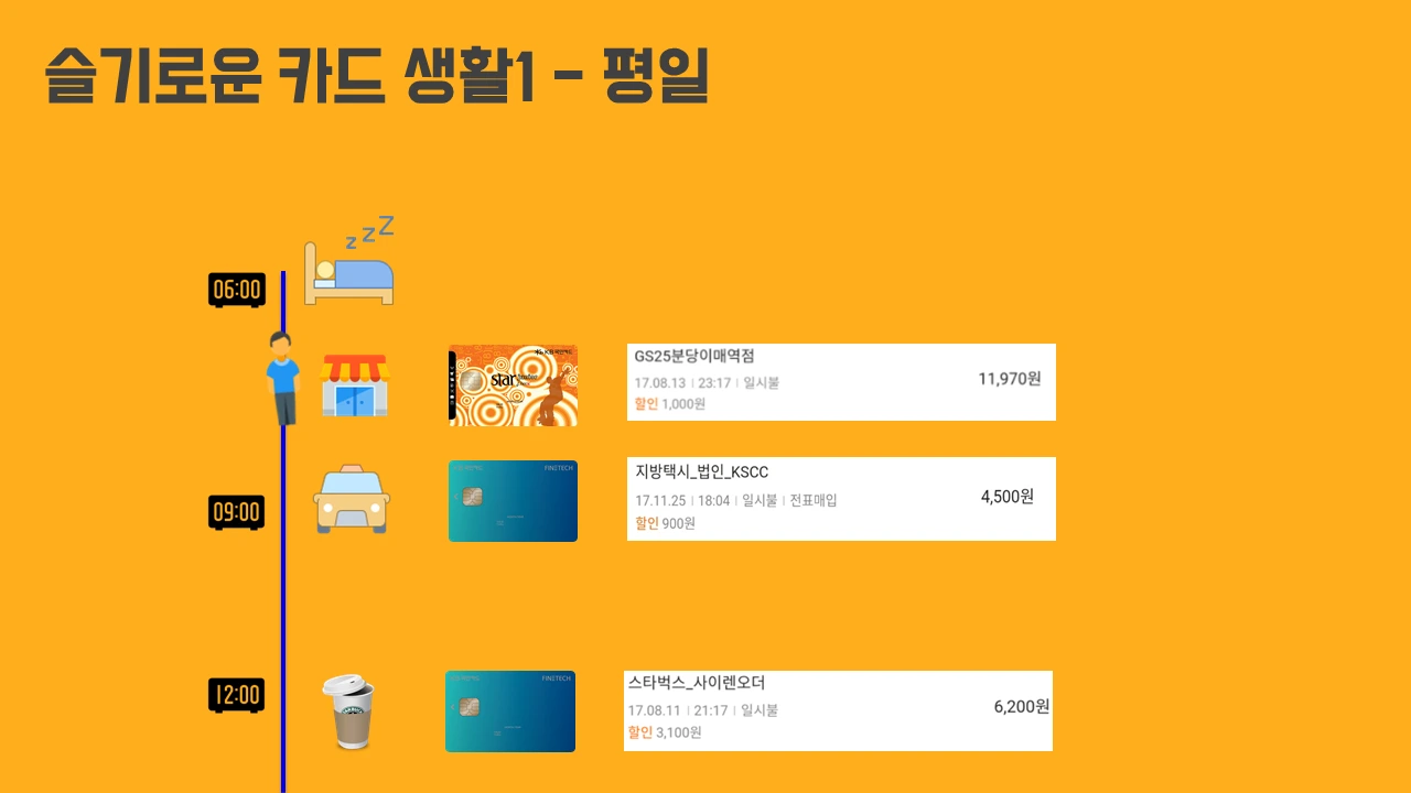 그러면 알파원 카드 한 장을 들고 일상에서 어떻게 활용할 수 있을까? 6시에 출근을 위해 일어났다. 잠시 GS25(편의점)에 들러서 주니어 스타 체크카드(굴비, 단종)로 10% 할인을 받고 아침을 해결한다. (참고로 이 카드는 편의점에서 한 번에 최대 천 원까지 밖에 할인이 안 된다.)