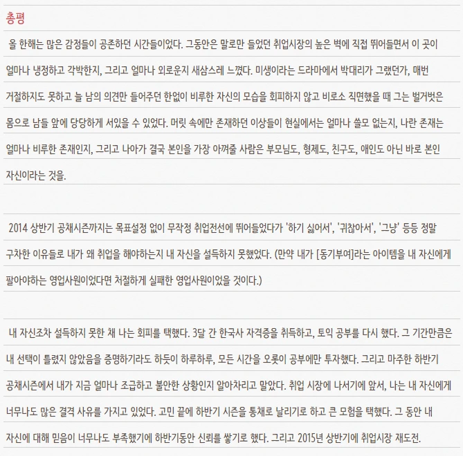 2014년은 참 힘든 한 해였다. 당장 취업이 되지 않아 불안했고, 그 과정을 겪으면서 어떤 선택이 옳고 그른 것인지, 또 무엇을 좋아하는지 몰라, 선택의 기로마다 지금의 선택이 최고인지, 최악인지 구별 조차 하지 못했다. 그 모습이 나를 더 비참하게 만들었다.