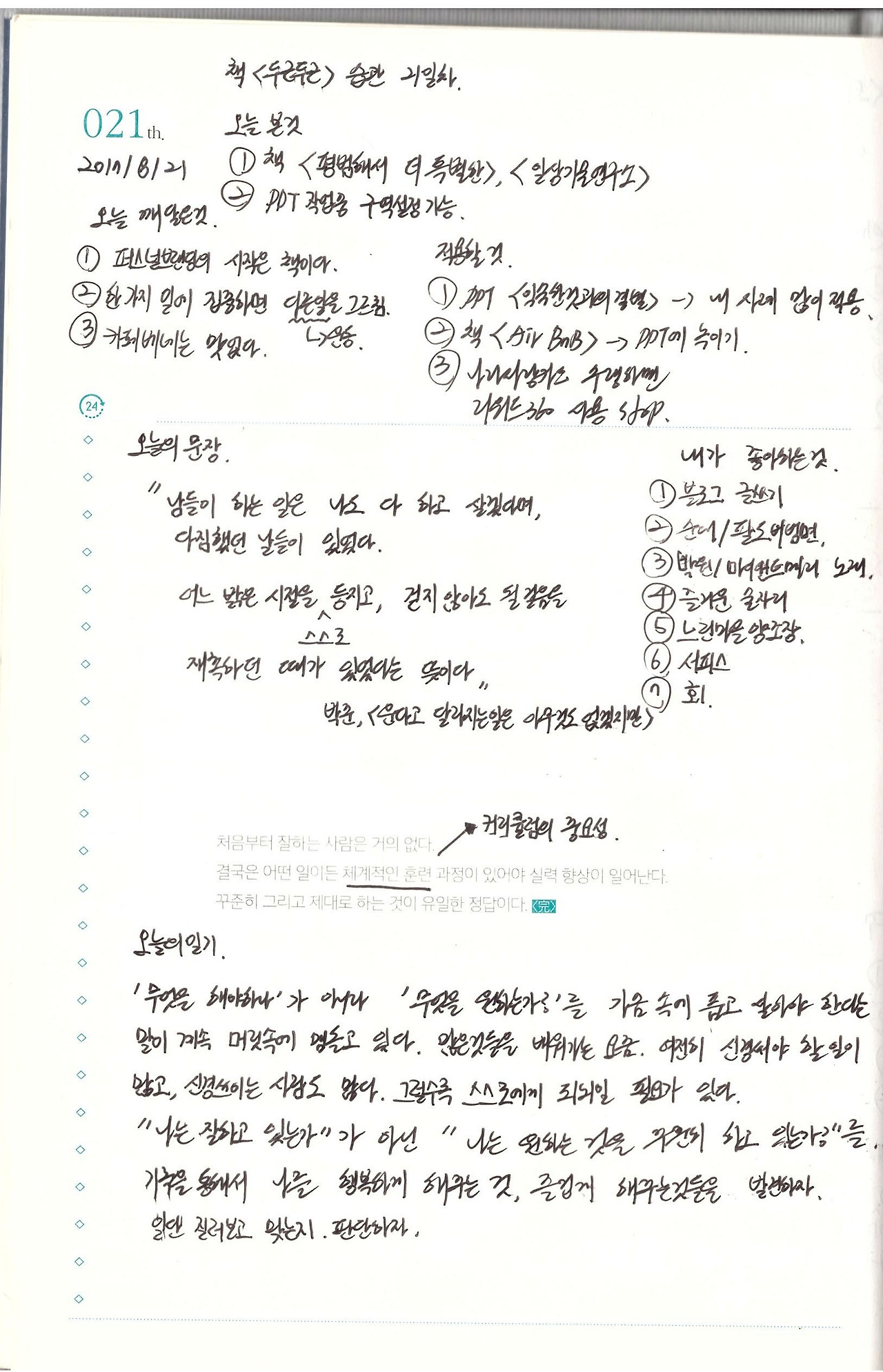 '무엇을 해야 하나'가 아니라 '무엇을 원하는가'를 가슴속에 품고 살아야 한다는 이 말이 계속 머릿속에 맴돌고 있다. 많은 것들을 배워가는 요즘, 여전히 신경 써야 할 일이 많고, 신경 쓰이는 사람도 많다. 그럴수록 스스로에게 되뇔 필요가 있다. '나는 잘하고 있는가'가 아닌 '나는 원하는 것을 꾸준히 하고 있는가'를. 기록을 통해서 나를 행복하게 해주는 것, 즐겁게 해주는 것들을 발견하자. 일단 질러보고 맞는지 판단하자.