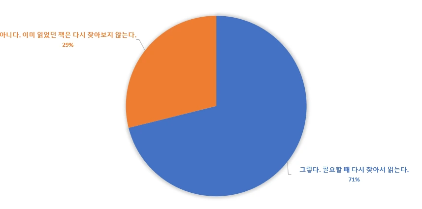 이미 읽었던 책을 다시 읽는 사람은 45명 중 32명(71%)이었다. 꽤 높은 비율이다. 그들은 왜 다시 읽는지 이유를 물었다. 이유는 크게 세 가지였다. 필요하거나, 재밌거나, 좋아하거나