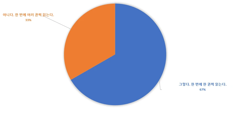 책을 읽을 때 한 권씩 차례대로 읽는다고 답한 사람은 45명 중 30명(67%)였다. 반면 한 번에 여러 권씩 읽는 사람들은 15명(33%)으로 설문을 하기 전 예상했던 것보다 훨씬 많은 수치였다. (10명 이하일 것으로 예측했다)