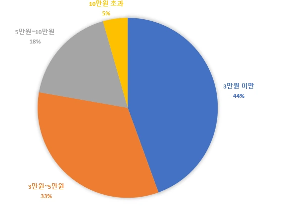 한 달에 독서에 지출하는 비용 또한 방금 살펴본 독서량과 분포가 비슷하다. 그렇다면 많이 읽을수록 독서 지출 비용도 클까? 꼭 그렇지는 않다. 한 달에 3~5만원 정도 독서 비용에 쓴다고 답한 사람들은 15명(33%)이었다. 하지만 이들 중 9명은 한 달 독서량이 1~2권이었다. 책 구입이 곧 독서로 이어지지 않을 수도 있다. (언젠가 읽겠다는 생각으로 구매하고 집에 쌓여있을 수도..)
