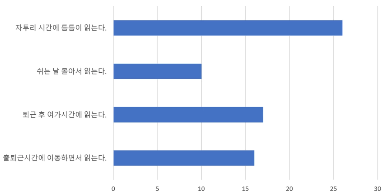 사람들은 주로 언제 책을 읽을까. 자투리 시간에 틈틈이 읽는다는 사람(26명)이 가장 많았다. 틈틈이 책 읽으면 얼마나 읽겠어? 라고 생각하기 쉽지만, 막상 그 시간에 읽어보면 쌓인 독서량을 무시 못한다. 되려 사람은 시간이 없다고 느낄 때 생산성이 올라간다. 시간이 넉넉할 때는 독서에 제대로 집중하지 못할 때가 있는 반면, 자투리 시간에도 독서에 깊이 집중할 수 있다. 퇴근 후 여가 시간에 주로 읽는다는 사람이 뒤따랐다.(17명) 주 52시간제가 시작되면서 퇴근 후 회사 동료들과 술자리 대신 취미 활동을 늘리는 사람이 부쩍 늘었다. 취미가 없다고 한탄하지말자. 독서는 가장 저렴한 취미다. 그리고 출퇴근 시간에 이동하면서 읽는다는 사람(16명)이 뒤따랐다. 출퇴근 시간이 편도 1시간이 넘는다면 이 시간을 활용해서 책을 읽는다면 독서량이 꽤 된다.(물론 피곤할 때는 내려놓고 졸자)