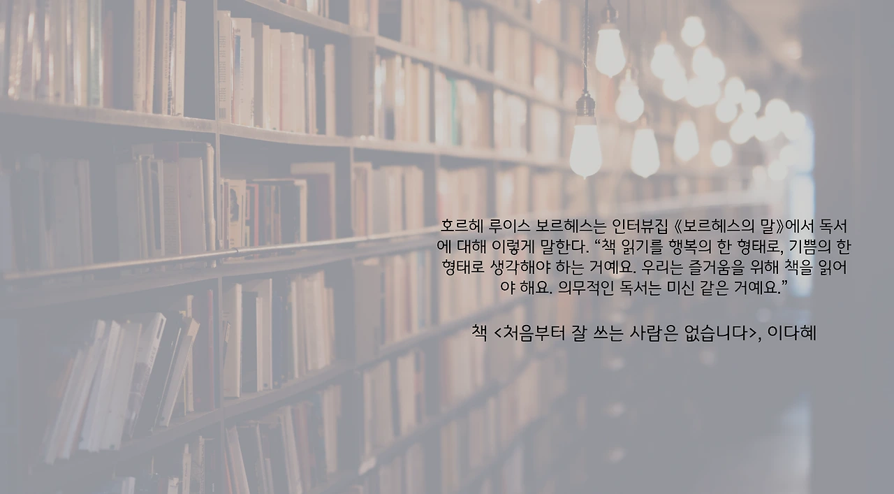 이번 독서의 취향 글을 마무리하니 지루함을 이겨내기 위해 여러 권의 책을 번갈아 읽는 사람들의 대답이 유독 인상 깊다. 우리는 어쩌면 그동안 '의무적인 독서'에 부담을 느꼈을지 모른다. 읽지 않을 때는 죄책감을 느끼고, 그것을 합리화하기 위해 어떨 때는 독서에 반감을 가진 채로 비난했을지 모른다. 하지만 보르헤스가 말한 것처럼 우리는 읽는 내내 즐거워하며 독서를 행복의 한 형태로, 기쁨의 한 형태로 만들어내야한다. 여러 권의 책을 번갈아 읽으며 독서의 재미를 유지하는 사람들처럼.