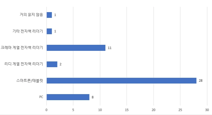 전자책을 읽을 때 사용하는 리더기는 크레마 계열(사운드, 그랑데 등)이 리디 계열(페이퍼 시리즈)에 비해 월등히 많다. 하지만 전자책을 읽는 대부분의 사람들은 전자책 리더기가 아닌 매일 들고 다니는 스마트폰이나 태블릿을 주로 활용했다. 이번 설문에 포함시키지 않았지만 주변 사람들에게 전자책 리더기를 사용하지 않는 이유를 물었다. '별도의 기기가 필요하다', '속도가 느리다', '구입해서 읽을 만큼 많은 책을 읽지 않는다', '종이책이 아직은 더 좋다' 등으로 아직까지 전자책 리더기를 이용해서 책 읽을 필요성을 느끼지 못하고 있었다. 전자책 시장은 꾸준히 크고 있지만, 전자책 리더기 시장은 아직 갈 길이 멀다.