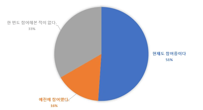 독서모임에 참여하고 있거나 과거에 참여해본 적이 있는지 물었다. 예전에 참여했거나, 지금도 참여 중이라는 사람이 45명 중 30명(67%)이었다. 설문에 참여한 대부분의 사람들이 책을 좋아하는 사람들이라 독서모임에 참여하고 있는 경우가 많았다. 그래서 결과를 보고 '우리나라 사람들이 독서모임에 많이 참여하고 있구나'라고 생각하기보다 '책을 좋아하고 독서모임에 참여하고 있는 사람들은 이런 생각을 가지고 있구나'로 이번 설문을 이해하면 좋을 것이다.