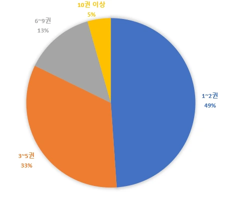이번 설문조사에서 한 달에 평균 1~2권 정도 읽는다고 응답한 사람들은 전체 응답자 45명 중 거의 절반인 22명을 차지했다. (49%) 독서량이 늘어날수록 인원은 줄어든다. (한 달에 10권 이상 읽는 사람은 45명 중 단 2명이다)