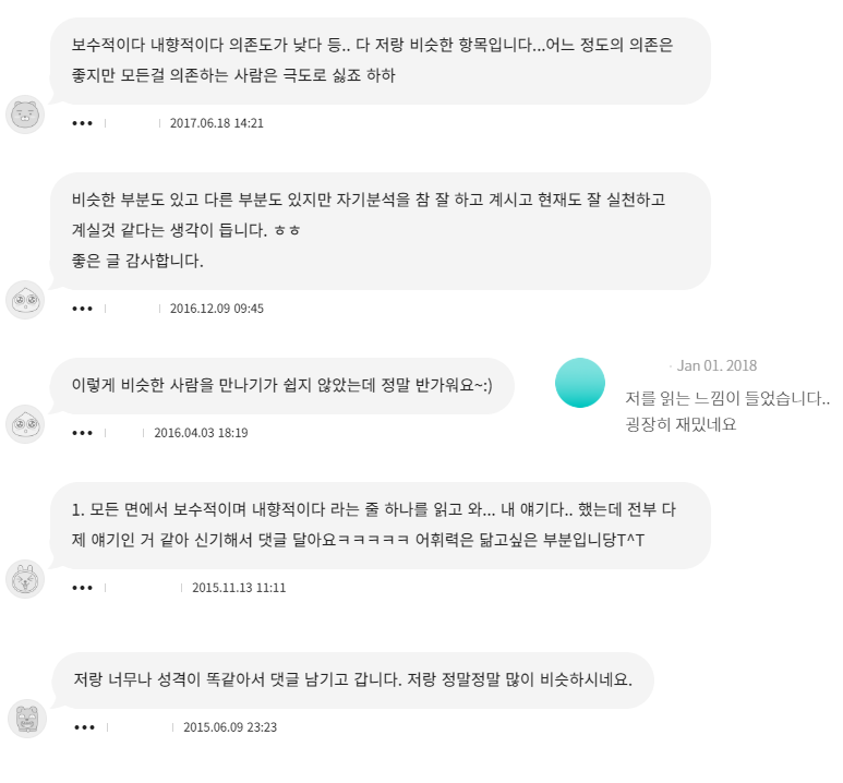 몇 주 간에 걸쳐 글을 발행하자 댓글이 달렸다. 대부분이 "성격이 저랑 비슷해요"였다. 혼란스러웠지만 갑자기 웃음이 났다. 남들에게 드러내니 나와 비슷한 사람들 투성이었다. 애초에 혼자 끙끙 앓을 필요가 없었다. 누구나 공동체에서 벗어나면 소속감의 부재로 인해 고립감을 느꼈고, 유독 특이하다고 생각했던 성격은 평범한 성격이었다. 그로 인해 졸업 후 갈피를 못 잡는 모습이 나에게만 해당되지 않을 것이라는 확신이 들었다.
