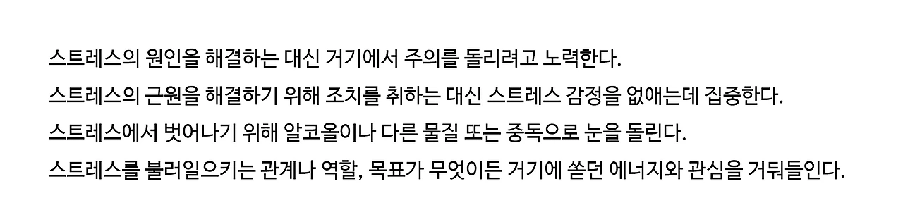 책 『스트레스의 힘』을 읽기 전까지 나는 스트레스를 받을 때마다 주변에 도움을 받는 대신 몇 날 며칠을 꽁꽁 숨었고 시간이 곧 해결해줄 것이라고 믿었다. 하지만 이 책에서는 나처럼 생각했던 사람들은 '스트레스는 무조건 해롭다'라고 말하는 경향이 크다고 얘기한다. 그리고 그들은 스트레스 대처방법으로 '회피'를 선택할 확률이 높고, 다음과 같이 행동할 가능성이 크다고 말한다.