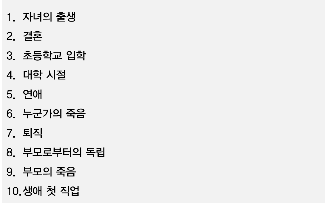 책 『순간의 힘』 에서는 도르트 번첸과 데이비드 루빈의 연구에서 응답자들에게 갓난아기가 앞으로 자라면서 삶에서 겪게 될 가장 중요한 사건을 답하는 설문을 진행했다. 그들이 가장 많이 꼽은 사건은 빈도에 따라 다음과 같다.
