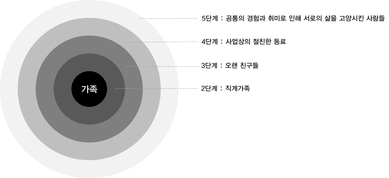 5단계에 해당하는 사람들은 전화를 걸거나 이메일을 보내 그들이 공유하는 지난날의 추억이나 행복한 기억들에 대한 이야기를 나눴다. 3~4단계에 해당하는 오랜 친구와 절친한 동료들은 직접 얼굴을 맞대고 만나 이제껏 나눠준 우정에 감사를 표했다. 마지막으로 여름 내내 호수 근처 별장에서 아내와 딸, 그리고 직계 가족과 함께 많은 시간을 보내며 눈을 감았다. 그는 마지막 순간에 느낀 감정을 이렇게 썼다.