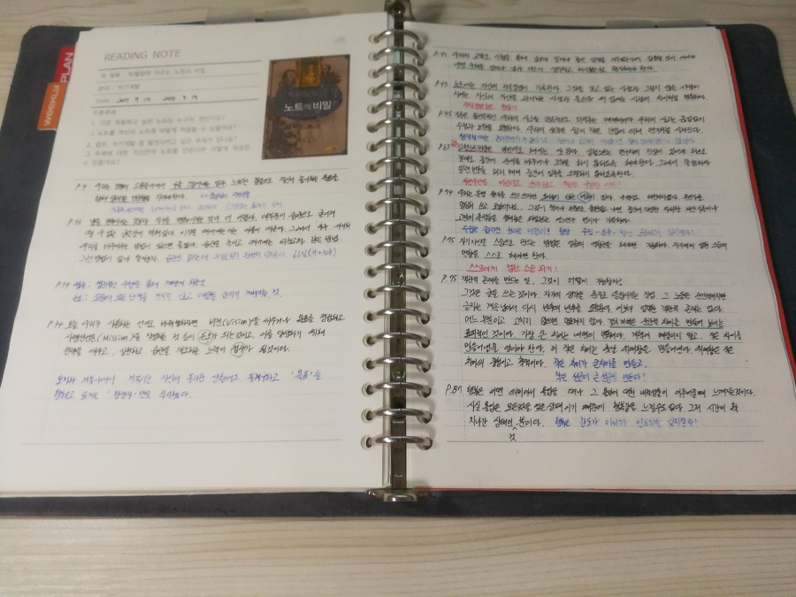 메모는 삼색펜을 활용하여 본깨적(본 것, 깨달은 것, 적용할 것) 방식으로 정리했다. 모든 책이 독서노트로 남는 건 아니었지만, 수년간 독서하면서 수십 권의 책이 독서노트로 남았다. 질 좋은 종이 위에 인상 깊은 문장을 적는 감각은 끝내준다. 책 읽는 시간만큼이나 독서노트를 정리하는 시간도 오래 걸렸지만, 글자를 적어 내려가면 문장을 꼭꼭 씹어먹는 기분이 들었고, 그 순간만큼은 다른 세상과 분리되는 그 몰입감이 좋았다.
