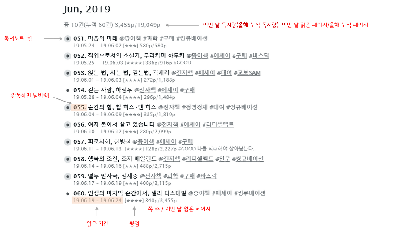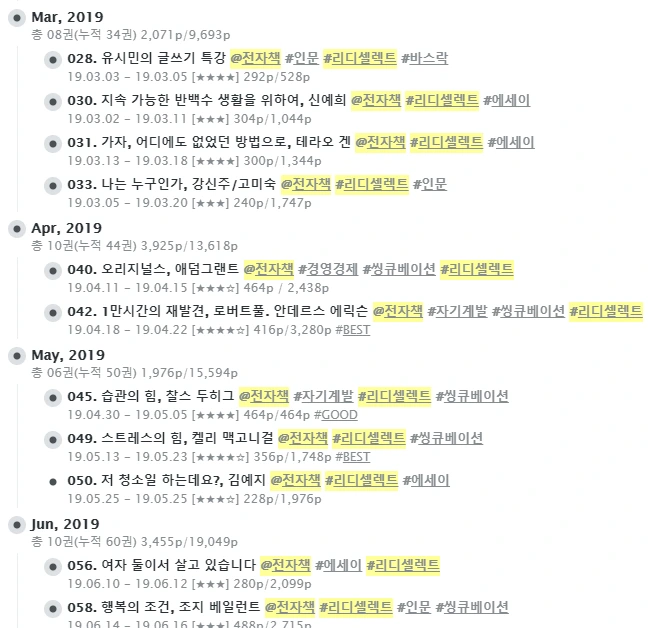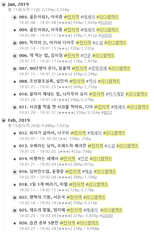 종이에 독서 리스트를 정리할 때는 불편한 점이 몇 개 있었다. 리스트를 관리하다가 갑자기 깜빡한 책이 나타나면 수정 테이프로 지워서 다시 적거나, 새로운 종이에 모든 리스트를 정리해야 했다. (성격상 늘 후자에 가까웠다.) 독서 리스트를 적어야한다는 사실을 깜빡학 때는 상반기가 끝날 때나 연말이 돼서야 그 사실을 인지하던 해도 있었다. 무엇보다 읽다만 책이 몇 권이나 되는지 파악이 불가능했다. 책은 매일같이 신간이 쏟아지기 때문에 지금 책을 읽다가도 또 다른 책이 읽고 싶으면 관심이 금방 휙휙 이동한다.