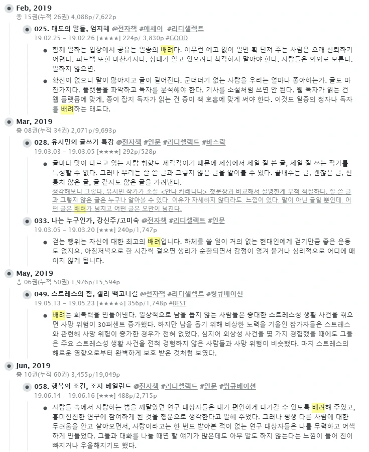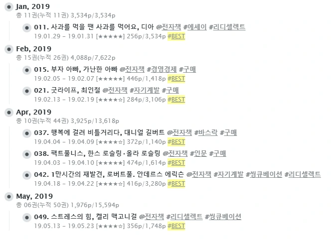 1월부터 리디셀렉트로 전자책을 읽으면서 매달 6,500원을 내고 있다. 상반기에 리디셀렉트로 본전을 뽑았나 확인하고 싶은 마음에 필터링해봤더니 갑자기 리디북스에 미안한 마음이 든다. 앞으로도 잘 이용해줘야겠다. 그 외에도 검색을 통해 아래와 같은 물음에 답할 수 있다.
