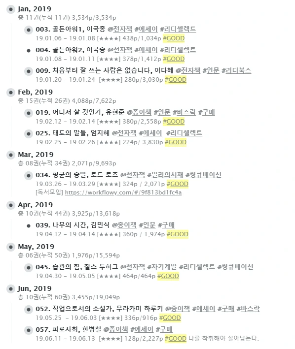 아날로그 방식의 독서노트를 포기하게 된 건, 수고로움이 큰 이유였지만, 독서 스타일이 전자책 쪽으로 기운 것도 한 몫했다. 그때부터 주로 WorkFlowy를 통해 독서 리스트를 관리한다. 바로 이번 글에서 이야기할 주제다. 처음에는 단순히 나열만 했던 독서 리스트가 조금씩 보완되더니 현재 방식으로 발돋움했다. WorkFlowy 독서 리스트에는 상당히 많은 정보가 들어있다.