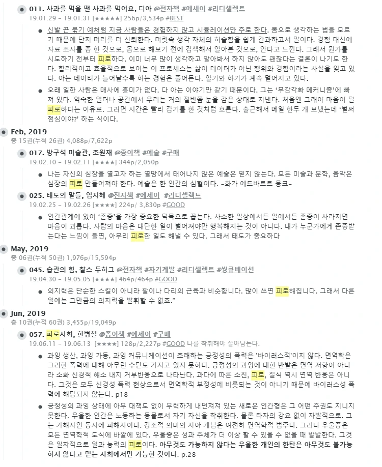 가장 좋아하는 검색 기능은 단연 키워드 검색이다. 올해 읽은 책 목록에서 '배려'와 '피로'로 검색해본다. 내가 읽은 책의 독서노트에서 해당 키워드가 포함되어 있으면 그 내용이 포함된 문장만 찾아서 보여준다. 글을 쓸 때 인용하거나, 따로 참고하고 싶을 때 무척 편하다. 이에 대한 자세한 내용은 지난 5월에 쓴 글이 있으니 그 글을 참고하면 좋다. (이전 글 : 워크플로위 독서노트 활용법)