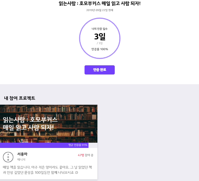 주변에서 여러 프로젝트를 운영하면 힘들지 않냐는 말을 많이 듣는다. 남들은 힘들지라도 몇 년째 여러 개의 프로젝트를 운영 중인 나에겐 별로 힘든 일이 아니다. 어차피 혼자서도 꾸준히 하던 습관이고 단지 사람들을 모아 함께 할 뿐이다. 2019년 4분기에는 프로젝트가 책 읽기 하나에 불과하지만, 내년에는 개인 차원에서 진행하는 프로젝트를 모두 카카오프로젝트100으로 가져와볼 예정이다. 이 방식이 내가 직접 기부하는 것보다 더 나은 방법이다!