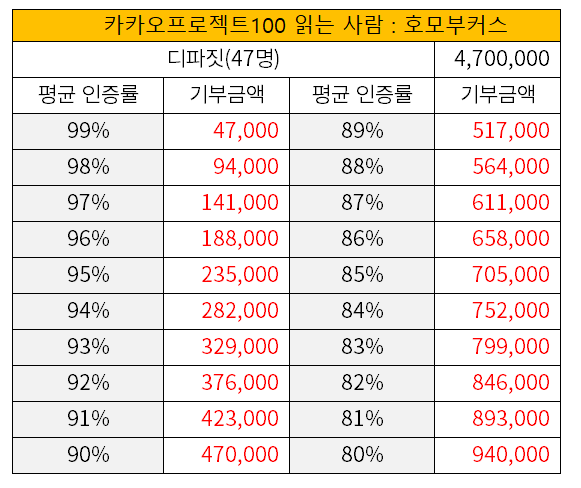 혼자 습관 만들기를 하다가 실패한 사람들은 다른 사람들이 모집하는 습관 모임에 참여하곤 한다. 무료 모임도 많지만 내 돈이 들어가지 않으면 꼭 해야 한다는 강제성이 떨어진다. 그래서 작게는 몇 천 원에서부터 많게는 수십만 원을 내야 하는 모임에 참여해 습관을 만들기 위해 기꺼이 참가비를 지불한다. 그런데 문제는 습관 만들기에 성공한다면 그 돈이 아깝지 않지만 또다시 실패할 경우 돈도 날리고 습관도 만들지 못하게 된다. 그런데 카카오프로젝트100에는 좋은 의도가 붙었다.