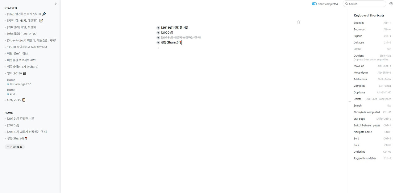 지난 1월에 WorkFlowy(링크, 이하 WF)에 관한 책을 출간했는데 그 이후로 9개월이 지났다. 그 사이 WF는 변하지 않은 듯 많이 변했다. 몇 가지 유용한 단축키가 추가되었고, WFx 확장 프로그램이 출시되었으며, Faster Item Menu, Left bar 기능이 새로 추가되었다.