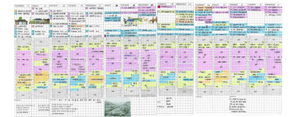 최근 3주간 내가 쓴 위클리다. 사진 화질 때문에 글자는 잘 안 보일지 몰라도, 형광펜으로 칠한 색깔이 눈에 확 들어온다. 색깔을 분류하자면 이렇다. 회색은 수면 시간, 분홍색은 업무, 노란색은 사람, 파란색은 자기 계발, 형광색은 개인 시간이다. 하루하루를 떼어내서 볼 때는 꼭 이렇게까지 색깔을 칠해야 하나 싶지만, 이렇게 3주로 모아두면 내가 어떻게 시간을 쓰고 있는지 패턴이 보이기 때문에 꼭 색깔을 칠한다. 나는 이 패턴을 통해 내가 최근에 어떻게 시간을 쓰고 있는지 유추할 수 있다.