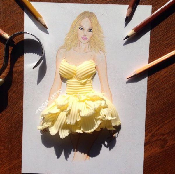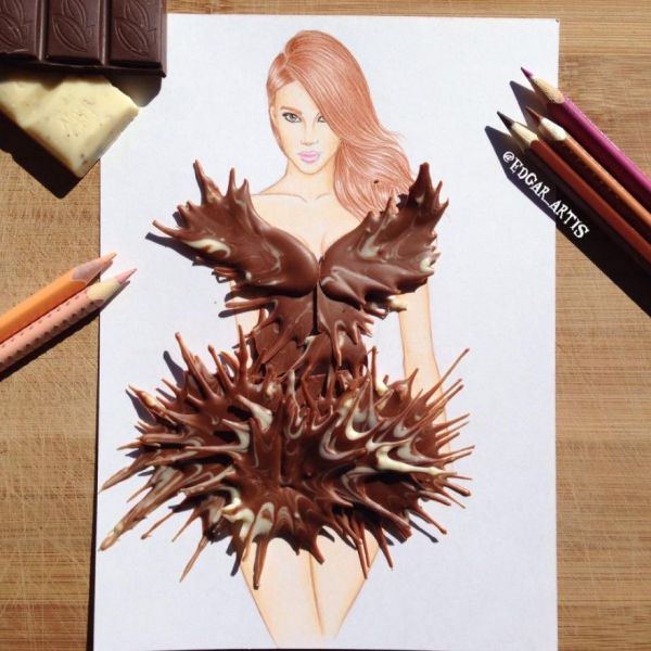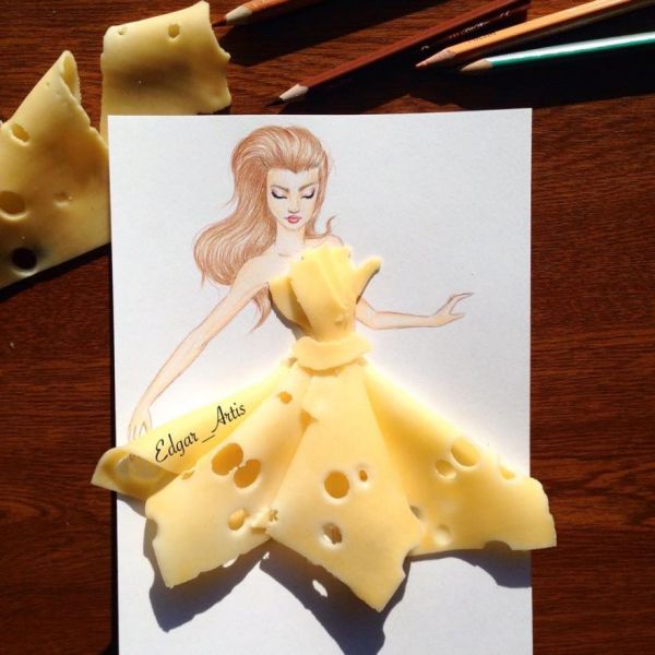 에드가 아티스(Edgar Arti)는 전문 패션 일러스트레이터로 때때로 런웨이에서 결코 볼 수 없는 그림을 그린다. 최근에 그는 음식으로 만든 여성의 옷을 그리고 있다. 그의 멋진 가운은 레몬 조각과 키위, 케이크, 팝콘으로 만들어진다.