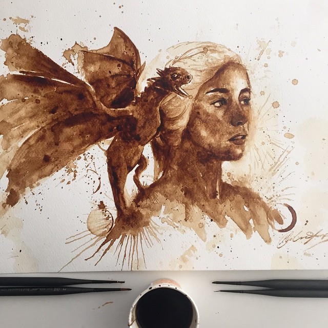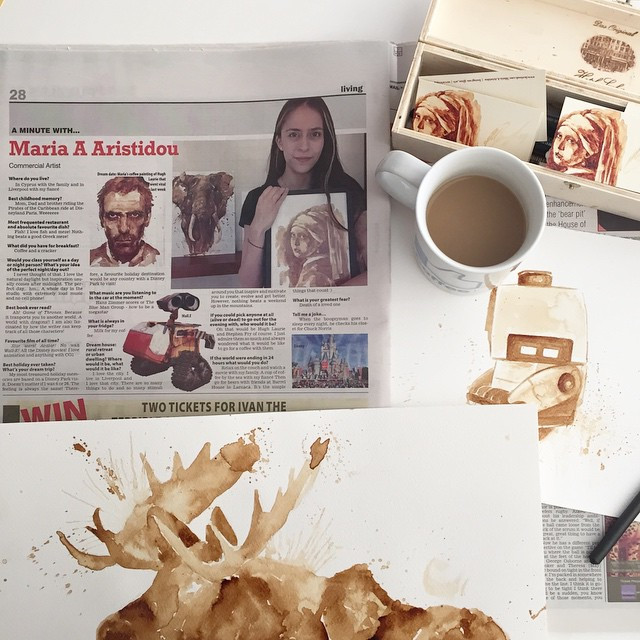 상업 아티스트이며 일러스트레이터인 마리아(Maria A. Aristidou)는 흥미로운 새로운 프로젝트를 진행한다. 그녀는 기존의 그림도구들을 버리고 사용하지 않는 새로운 재료, 바로 커피로 그림을 그린다. 마리아(Maria)는 첫번째 커피 일러스트 작품은 우연히 만들어졌다고 고백했다. 그러나 결과가 너무 좋아서 더 많은 작품을 그리게 되었다. 그녀는 그녀가 좋아하는 사람, 캐릭터, 동물들을 대상으로 커피로 그리는 것을 즐겨한다.