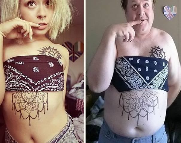 A comedian, from Washington, has taken to pranking his daughter online by copying her selfies, wearing the same outfits and even drawing on fake tattoos to match her real ones.