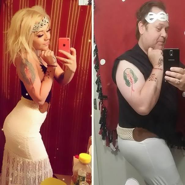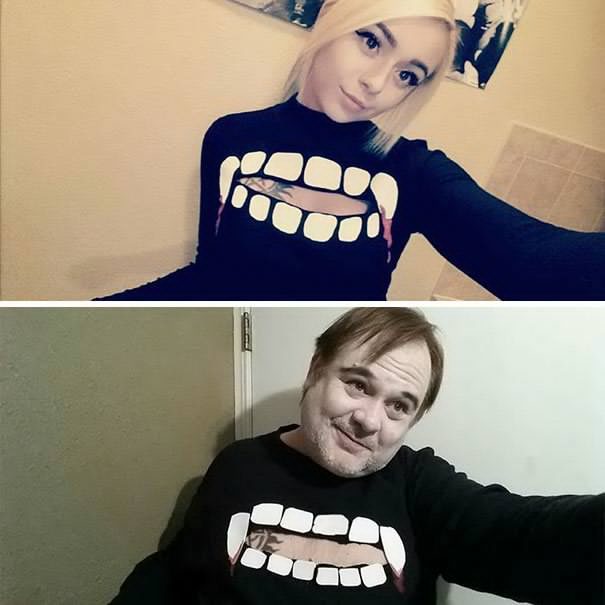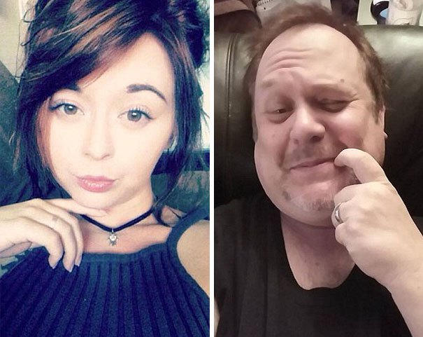 "아빠가 소셜 미디어에서 나를 괴롭혀요"라며 올린 글로 인해 그녀의 셀카를 따라한 아빠의 모습이 고스란히 노출되었다. 딸과 같은 표정을 하느라 타투에 소도구 분장까지 공을 들인 아빠의 정성이 돋보인다. 그래도 드러나는 뱃살로 웃을 수 밖에 없다. ^^