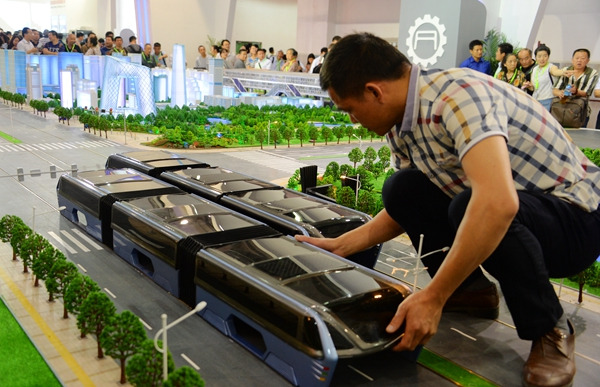 처음에 이런 걸 만든다고 컨셉카가 공개 되었을 때는 믿기지 않았는데 중국이 정말 이런 혁신적인 버스를 만들었다. 버스가 지나갈때 작은 차들은 레일에 걸리지 않도록 조심해야할 듯 하다.