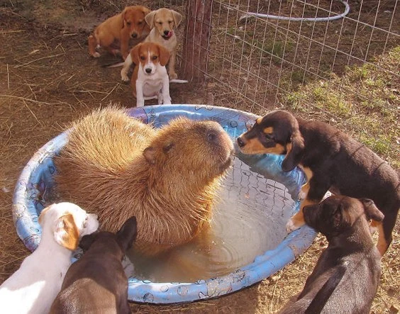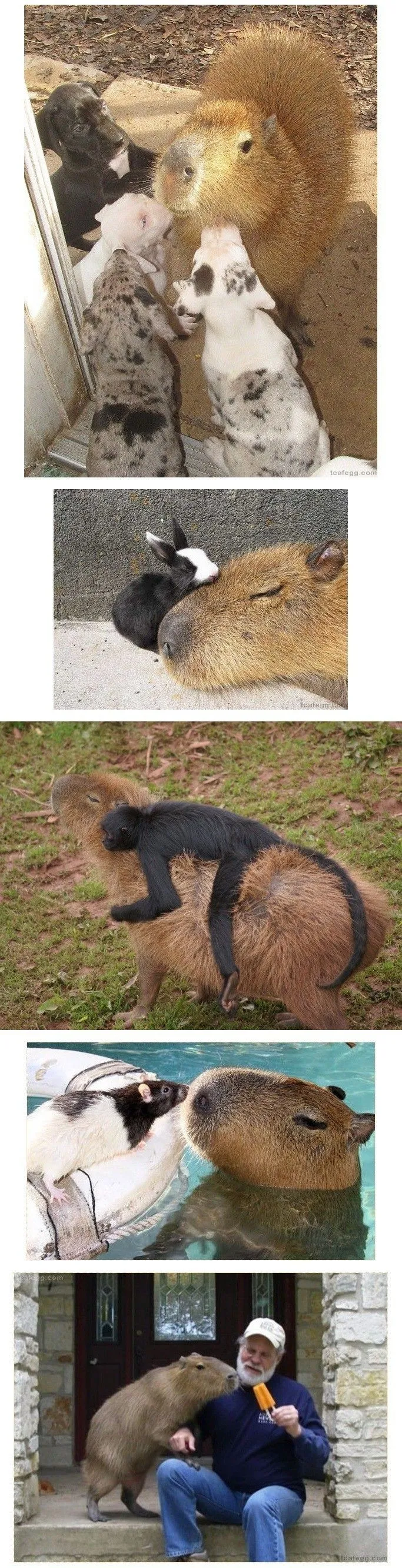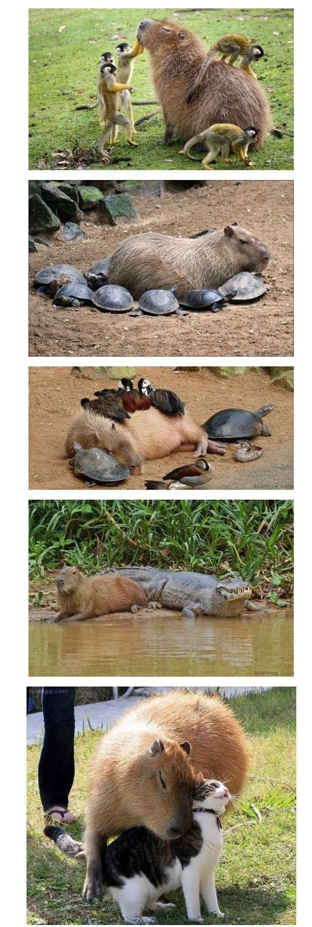 어떤 동물과도 친하게 지내는 친화력 극강의 동물은 카피바라이다. 카비바라는 주로 남아메리카 동부 아마존강 유역을 중심으로 따뜻한 물가에 서식하는 동물로 몸길이는 105-135cm 정도로 성격이 유순하여 새들이나 원숭이, 거북이, 개, 고양이, 토끼 등과도 잘지내며 심지어 악어와도 같이 지내는 모습이 등장한다.