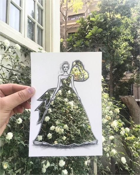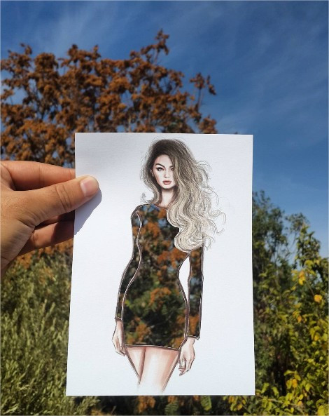 샤메크 블루위(Shamekh Bluwi)는 요르단 암만에서 활동하는 건축가이자, 패션 일러스트레이터다. 그는 자신이 그린 패션 일러스트의 옷감을 자연적인 도시의 풍경에서 찾는다. 종이에 그린 드레스 부분만 잘라내어 도시의 풍경을 옷감으로 바꾸어 준다.