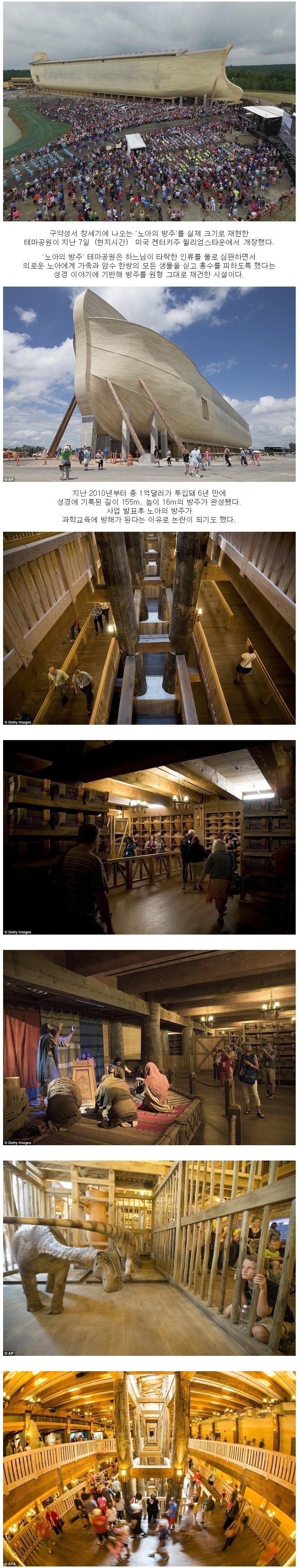 성경에 나오는 노아의 방주를 실제 크기로 만든 테마 공원이 개장되었다. 방주 크기가 성경에 자세히 묘사되었다고는 하지만 이걸 그대로 구현할 생각을 하다니 대단하다. 노아의 방주 테마공원은 2015년 미국 켄터키주 윌리엄스타운에서 개장하였으며 가까운 홍콩에서도 볼 수 있다고 한다.