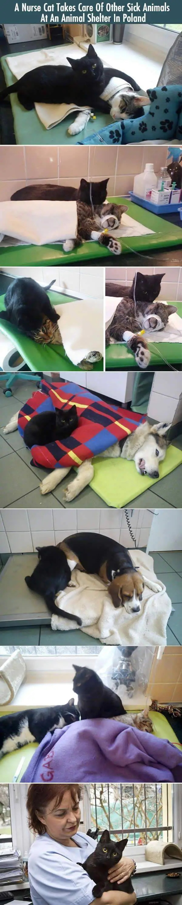Incredible Nurse Cat From Poland Looks After Other Animals At Animal Shelter Radamenes, an angelic little black cat in Bydgoszcz, Poland, has come through hell and high water to help the animals at the veterinary center there get better. After the veterinary center brought him back from death's door, he's returning the favor by cuddling with, massaging and sometimes even cleaning other animals convalescing from their wounds and operations.