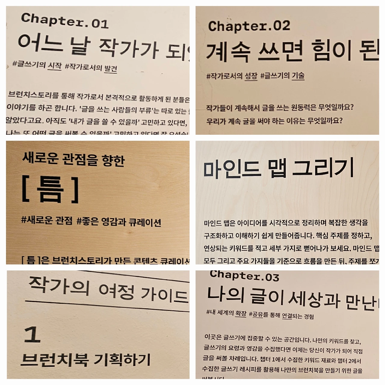 하얀 벽 가득 새겨진 브런치작가님 앞에 서 있으니 그분들이 저에게 얘기를 하는 듯 텍스트가 춤을 추고 춤의 향기가 눈과 귀로 들려옵니다. 브런치작가님들이 수없이 흘렸을 땀과 고뇌와 절망 그리고, 희망을 느끼며 두 손 번쩍 들어 격렬히 환호를 내지르며 마음속으로 물개박수를 힘껏 쳤습니다. 공간에 심취해 작가님을 따라가다 보니 영감을 주는 곳에 발길이 멈추었습니다. '마인드맵 그리기'와 새로운 관점을 향한 [틈]은 좋은 큐레이션이었습니다. 휴대폰으로 지금의 영감을 새기며 손안에 새겨 봅니다.