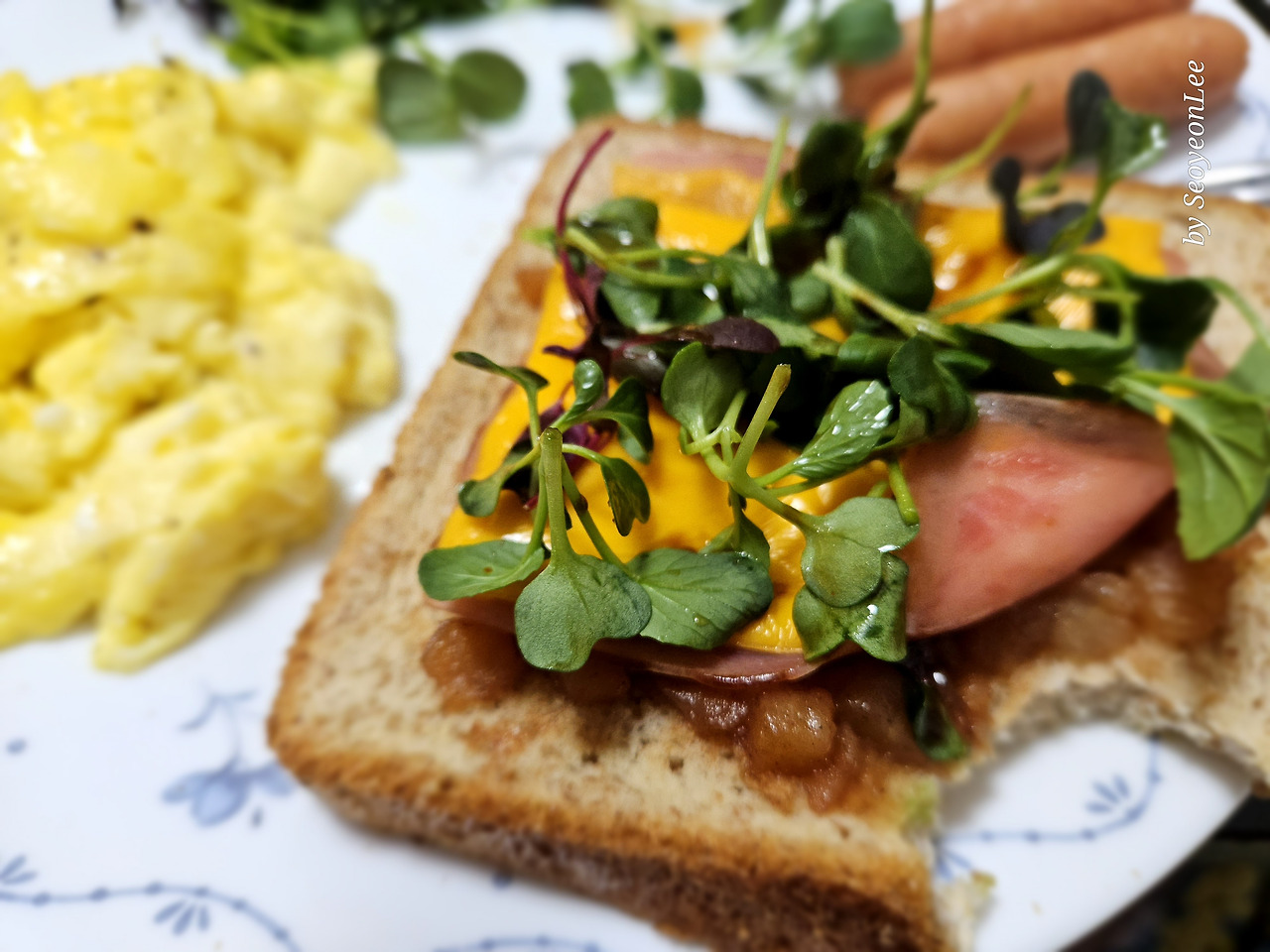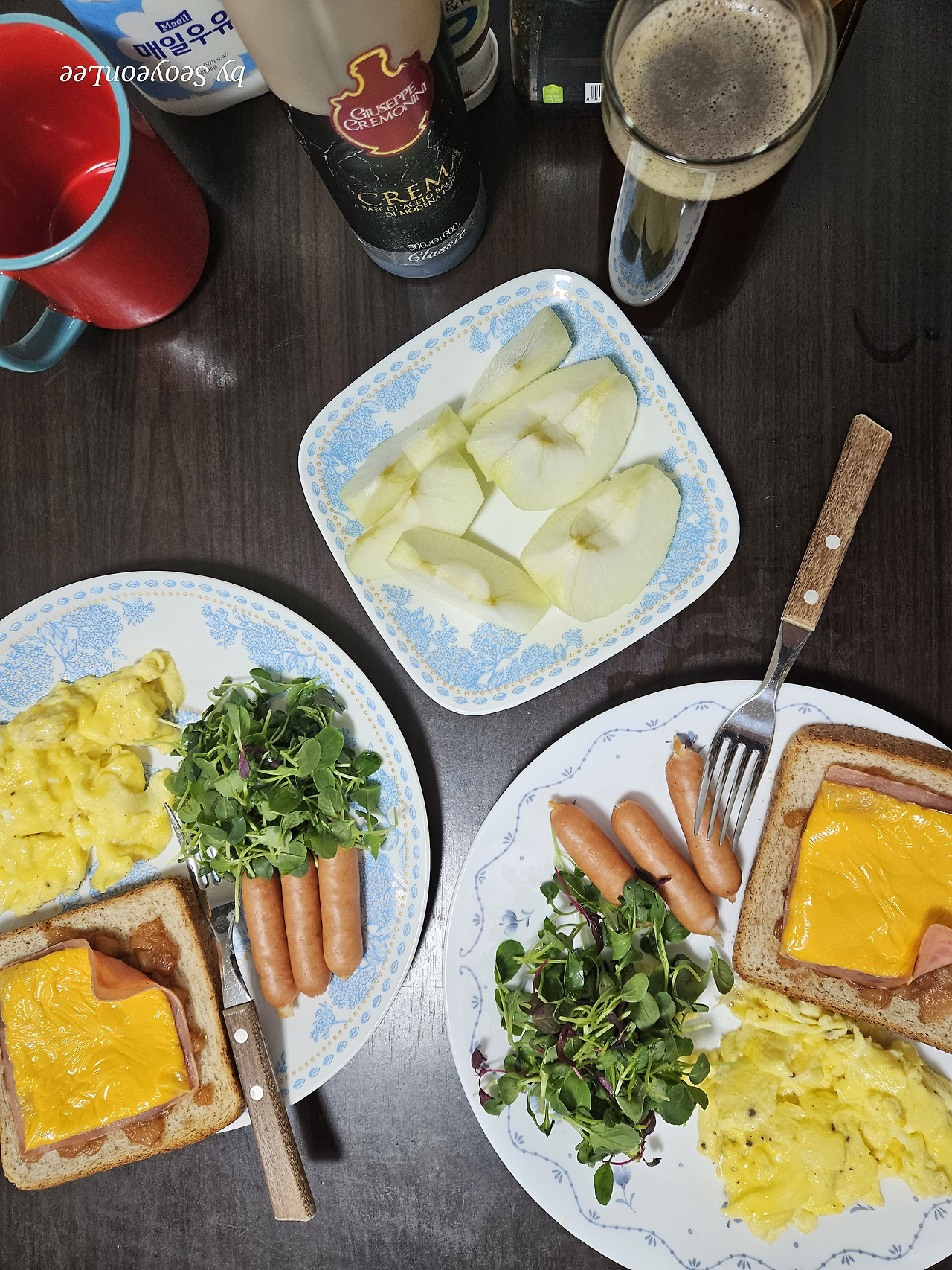 느긋하게 일어나 브런치를 차린다. 계란을 풀어 스크램블을 하고 토스트를 굽는다. 사과잼을 듬뿍 바르고 치즈를 올린다.